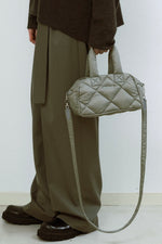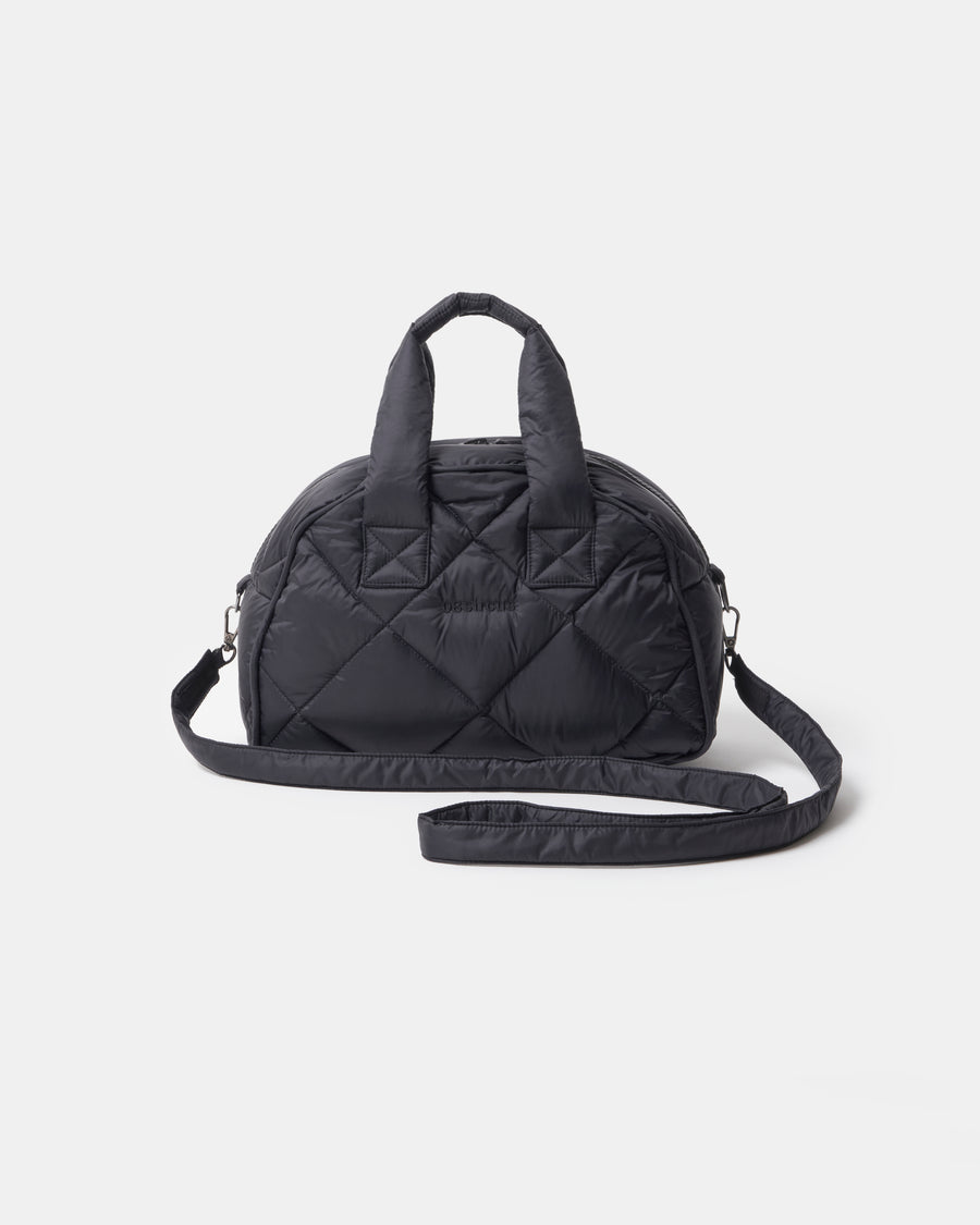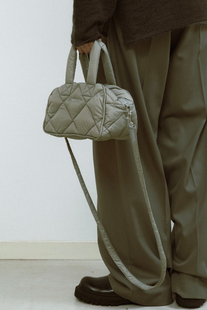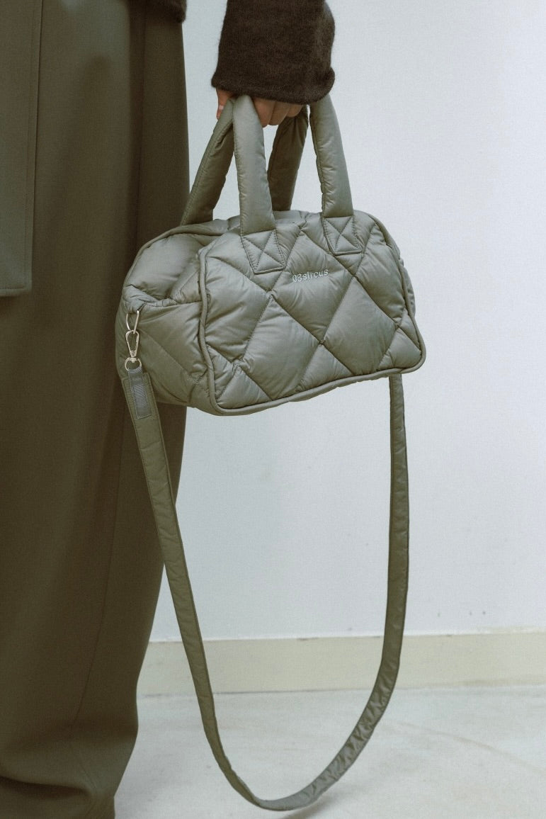 柔らかなフォルムと軽やかでふっくらとした質感を実現。マットなナイロン素材にダイヤ型のキルティングが施され、洗練された表情に。取り外し可能なショルダーストラップ付きで、手持ちでも肩掛けでも使える2WAY仕様。ミニマルでありながらスタイリングのアクセントとなる、実用性とデザイン性を兼ね備えたアイテム。