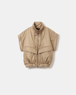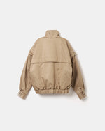 80年代のワイドなバランスをベースに、肩まわりや身頃にたっぷりとしたボリュームをもたせて構築的に仕上げたデザイン。パディングによる柔らかなフォルムとショート丈のバランスが、素材の質感とコントラストを生み出してモダンな佇まいをより一層引き立てる。