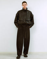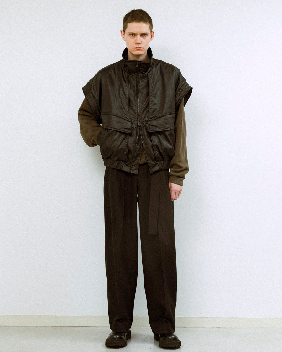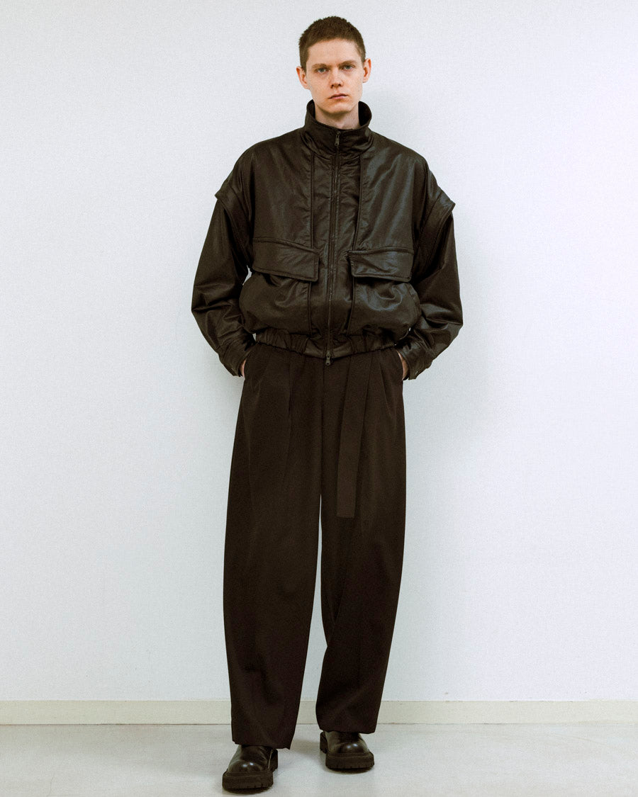 袖は取り外しが可能で軽やかなアウターへと変化させることができ、スタイリングや季節に応じた着こなしが可能。機能性とデザインが共存し、現代的な空気感を纏う。
