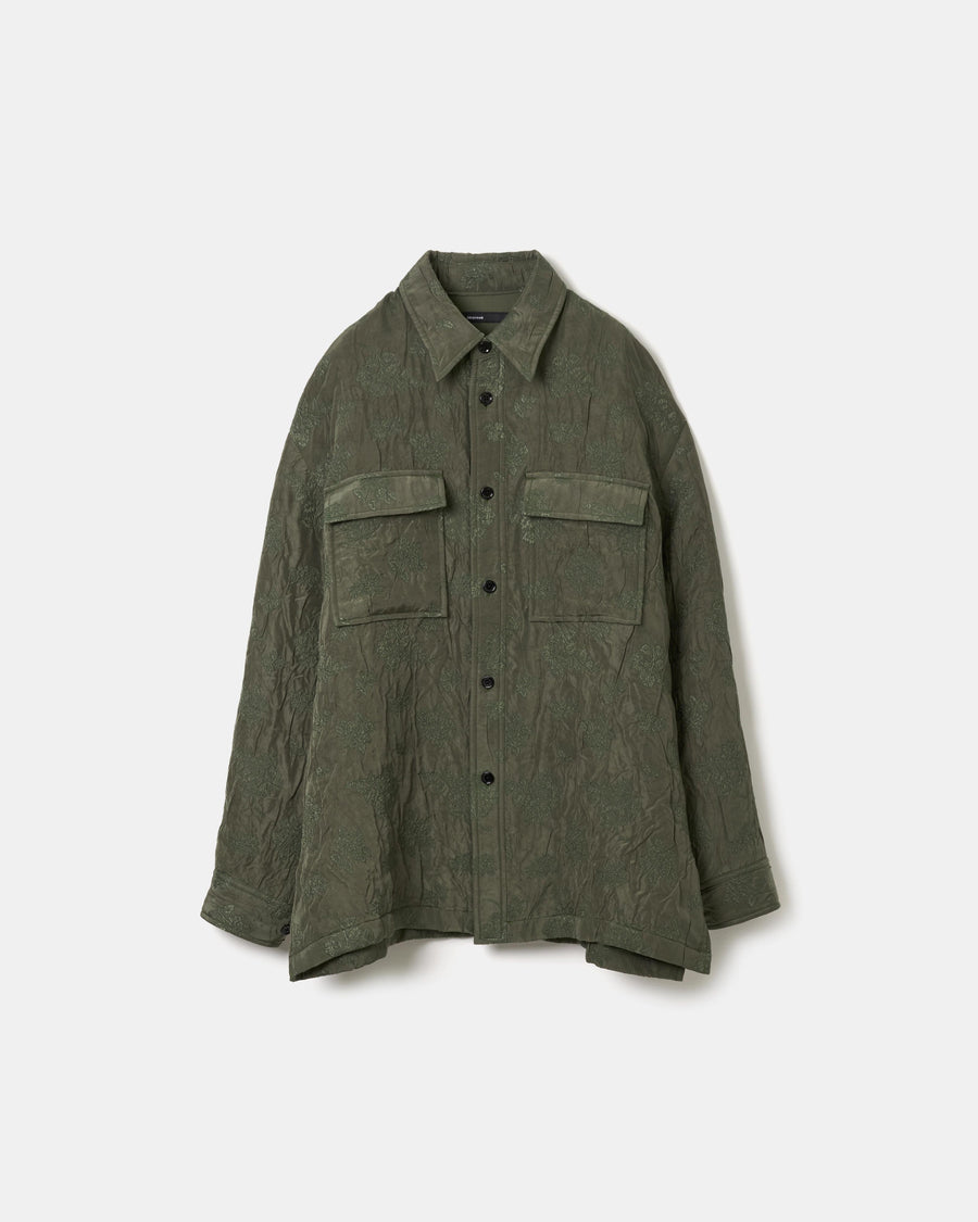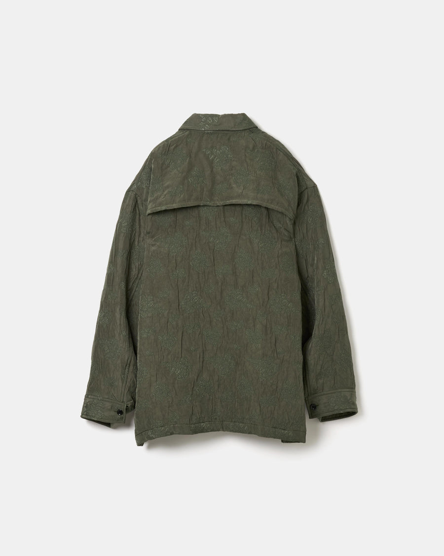 特徴的な素材は桐生で織り上げた膨らみのあるジャガード。パディングのような空気感を持ち、キュプラの上品な光沢とコットンの繊細なジャガード柄がアイテムに奥行きを与える。