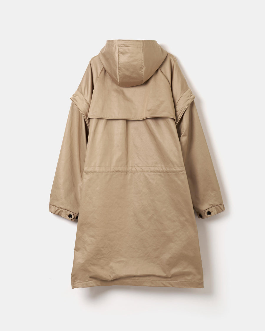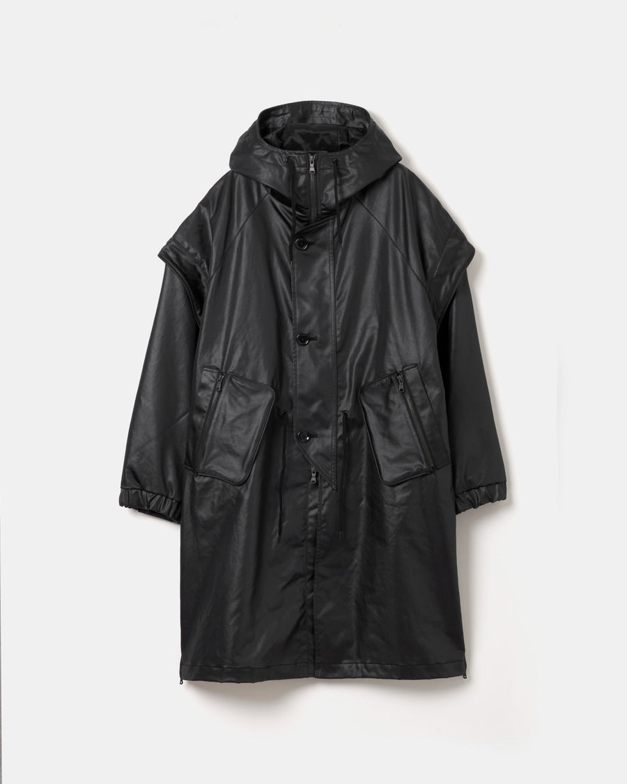 袖は取り外しが可能で軽やかなアウターへと変化させることができ、スタイリングや季節に応じた着こなしが可能。脇のファスナーを開けるとスリットが生まれ、レイヤードに奥行きとアクセントを加える。機能性とデザインが共存し、現代的な空気感を纏った1着。