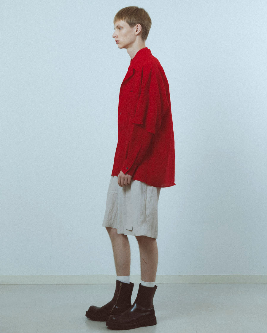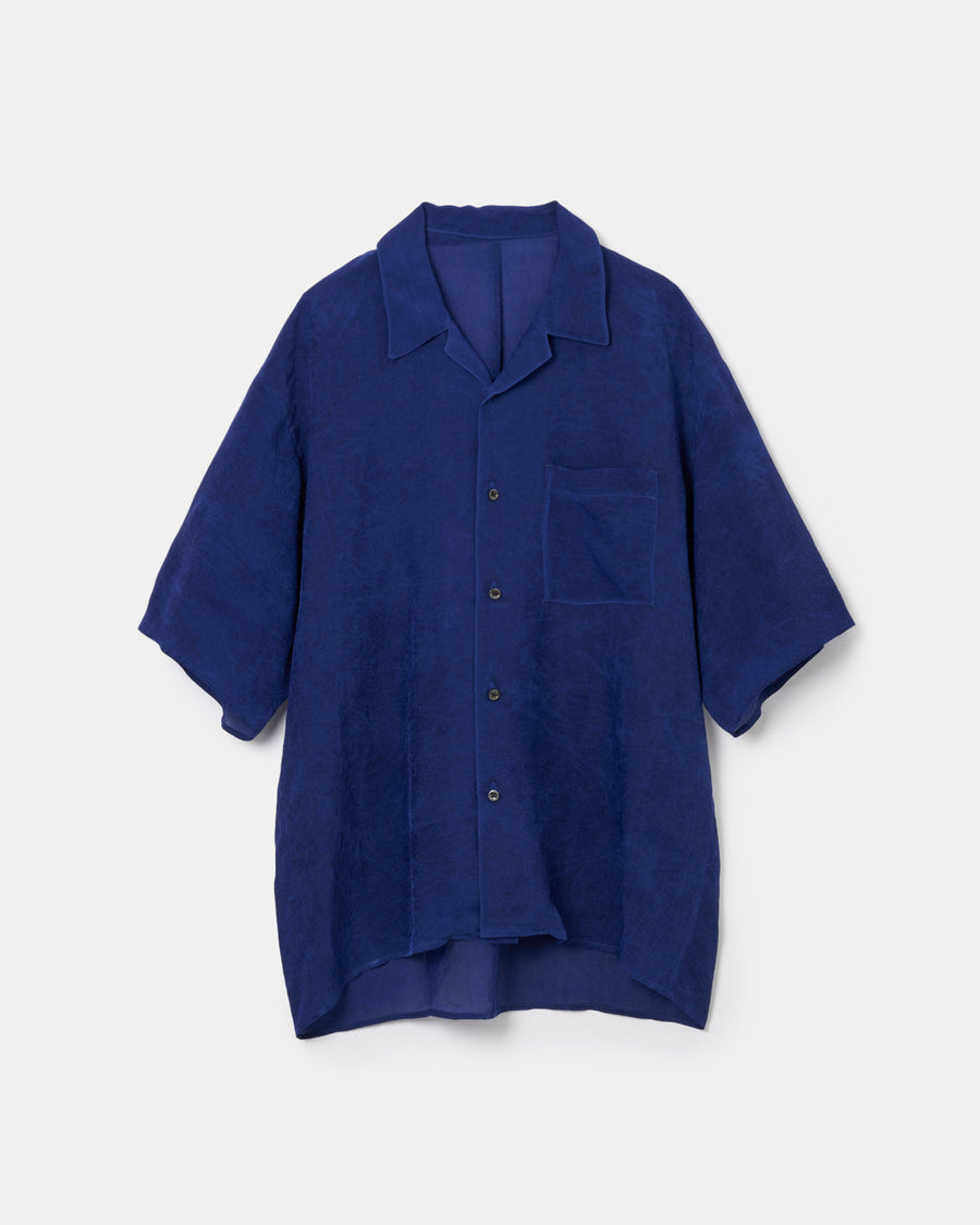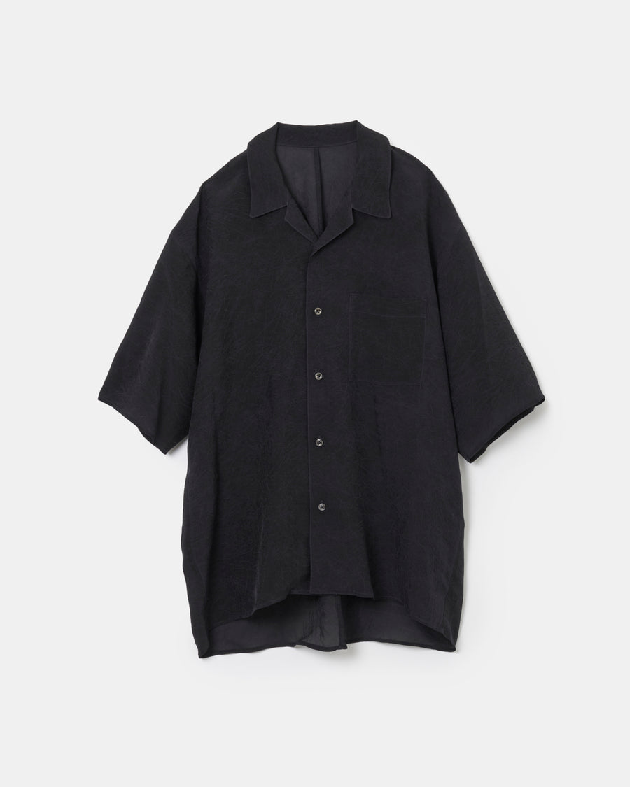 キュプラの生地に塩縮加工を施し、仕上げは加工による細かなシワを美しくセット。凹凸を抑えつつニュアンスのあるクリーンな表情に整えている。塩素によるわずかな色ムラが独特の陰影を生み、その特別感はまるで一点物。加工の質感と上品な透け感が合わさることで、エレガントな雰囲気を纏う。