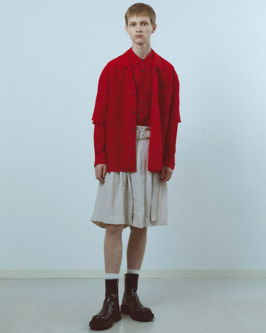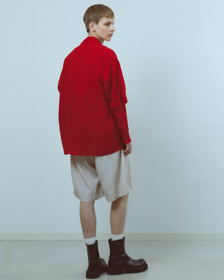 シルエットは、後袖が身頃から続くドルマンスリーブ。袖下や背中に丸みのドレープを作り出し、ゆったりとした分量感と程よい抜け感がポイントになっている。ウィメンズのシルエットをメンズに取り入れることで、ジェンダーレスなムードが漂う1着。