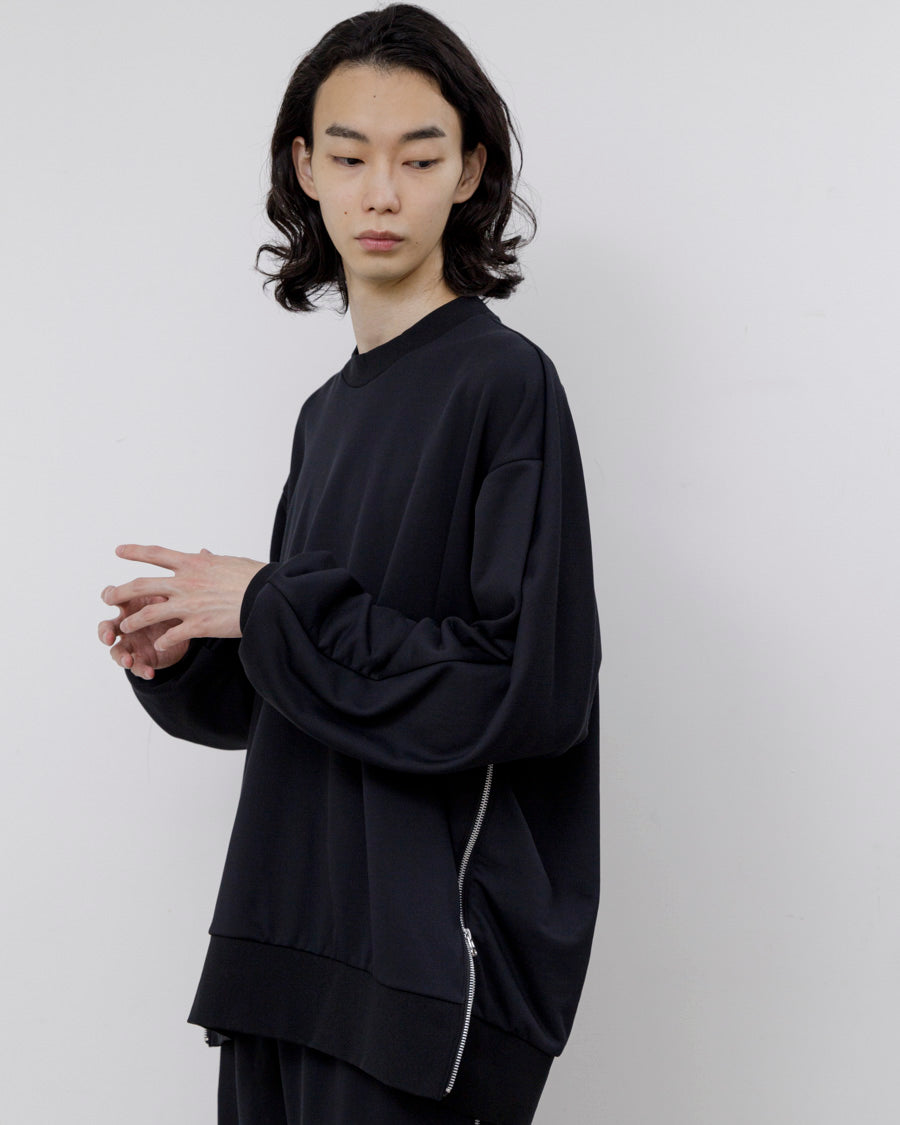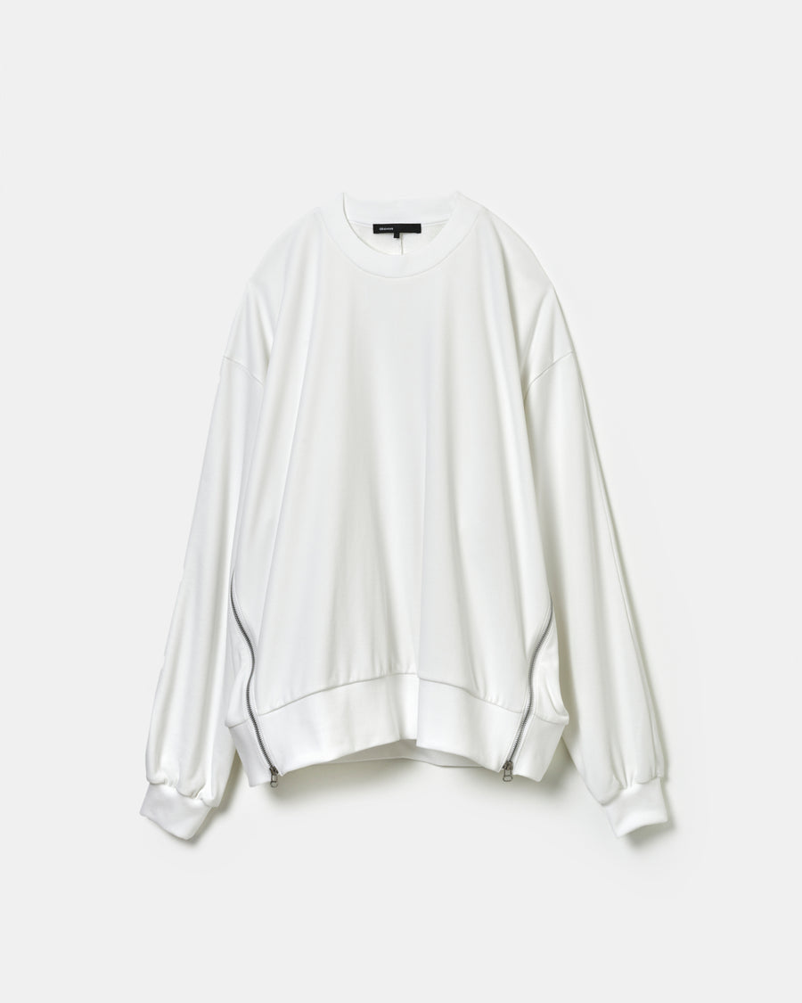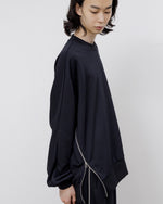 前袖はセットインでシャープな印象、後ろ袖はドルマンでゆったりとしたボリュームを入れることで前後で異なる表情を魅せる。脇のファスナーを開閉することで全体のシルエットに変化を加えられるところもデザインポイント。
