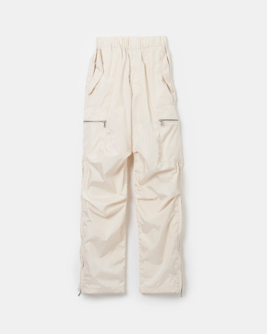 エアリーなタフタ素材で仕立てたパラシュートジップパンツ。