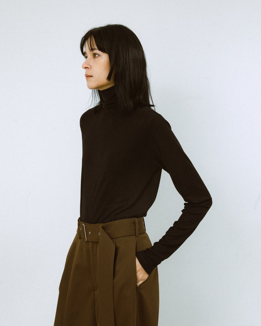 定番の人気インナー用ハイネックトップ。ストレッチジャージの素材は肌触りが良く、柔らかでなめらかな質感が特徴のリヨセルを使用。ストレッチ性にも優れ、首に沿うように設計されたデザインはカットソー、ニット、シャツと様々なスタイリングにプラスすることで、08sircusらしいスタイリングが完成する。