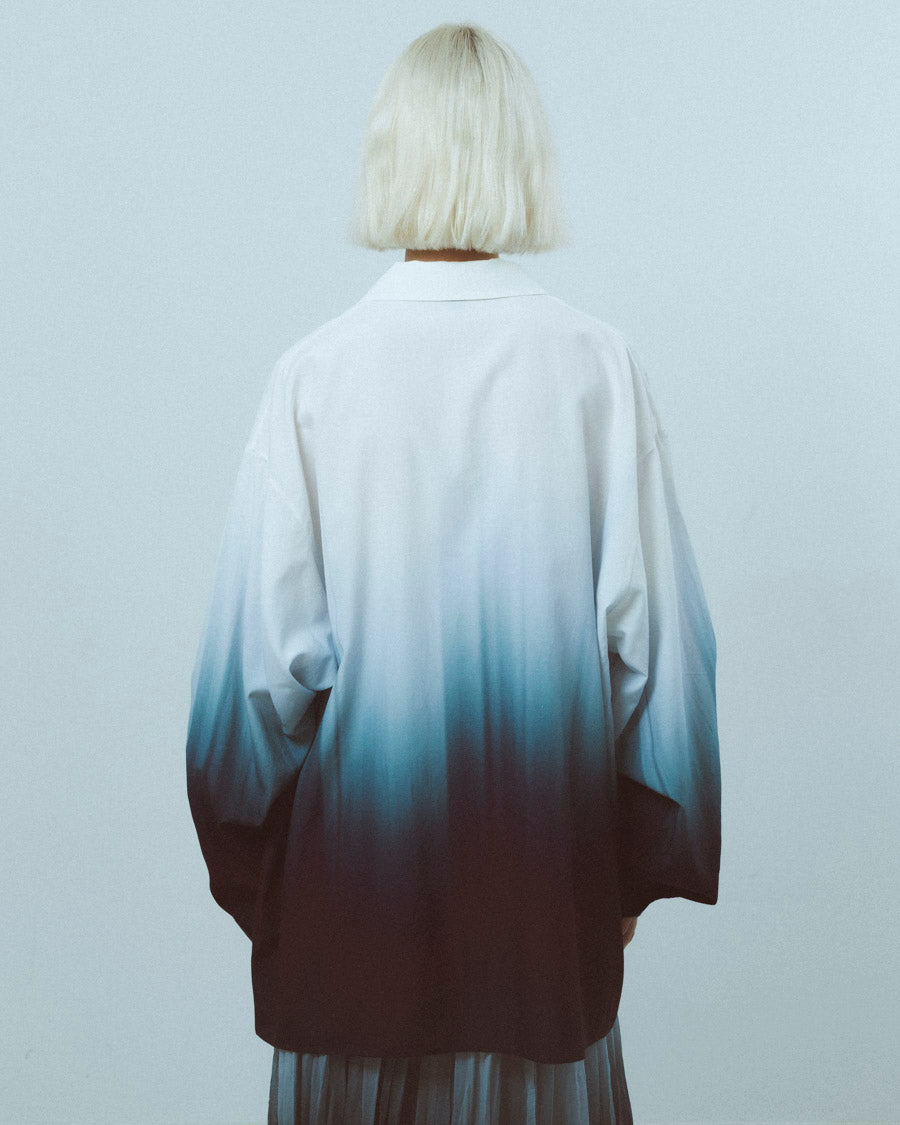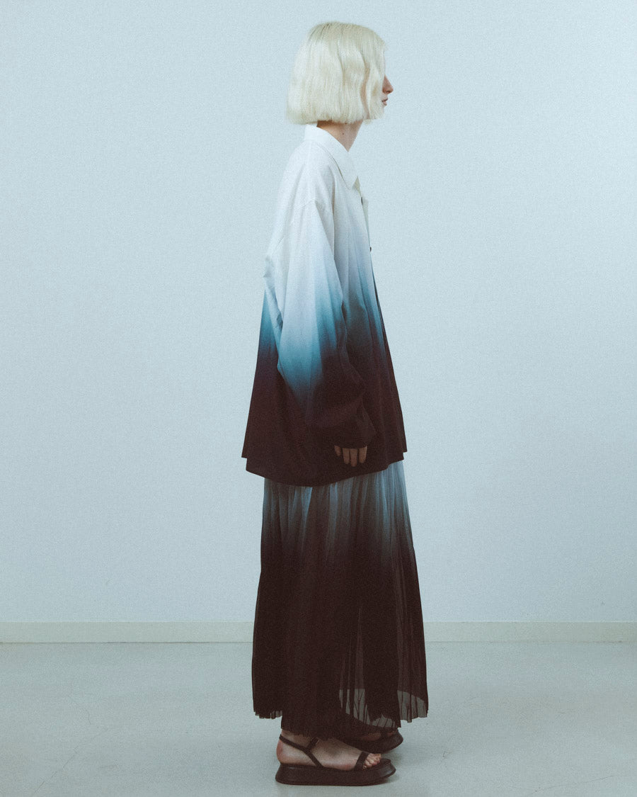 グラデーションはオリジナルプリントによる表現で、抜染により色が抜けて行く過程を1着の中に落とし込んでいる。