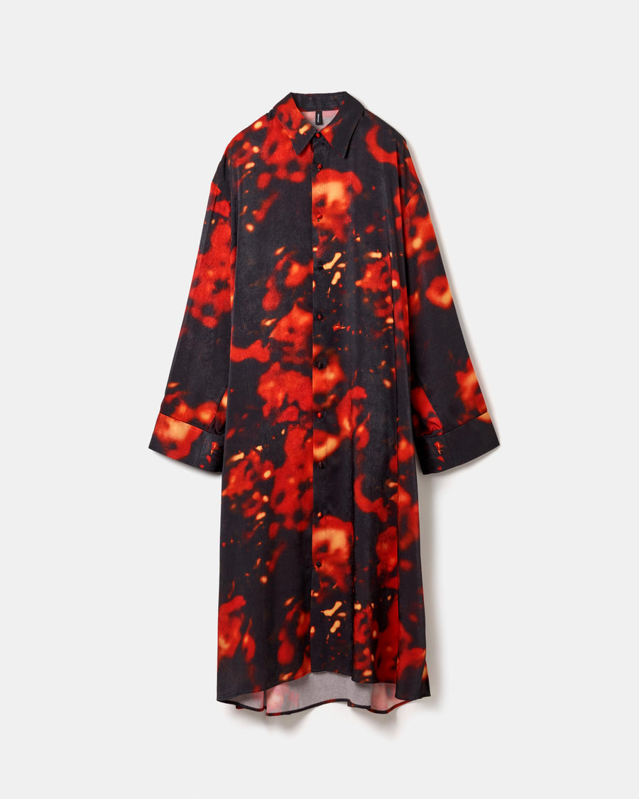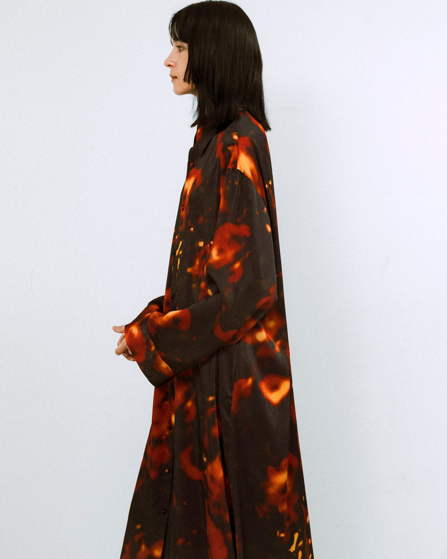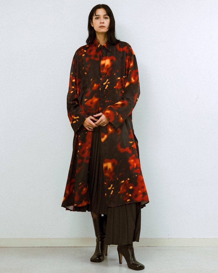 シャツとドレスの境界を曖昧にしたようなバランスと佇まいが魅力で、前ボタンを開け、ゆったりとした分量感の羽織りとしても着用可能。