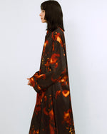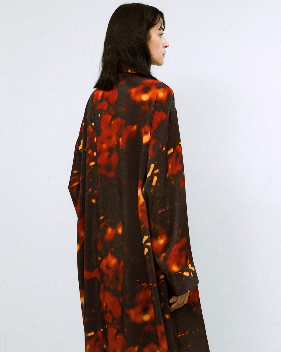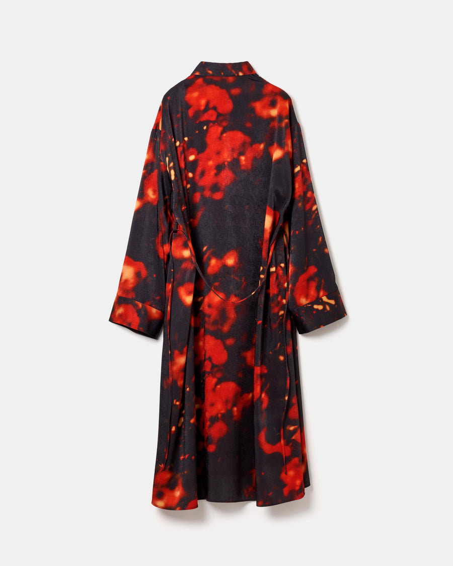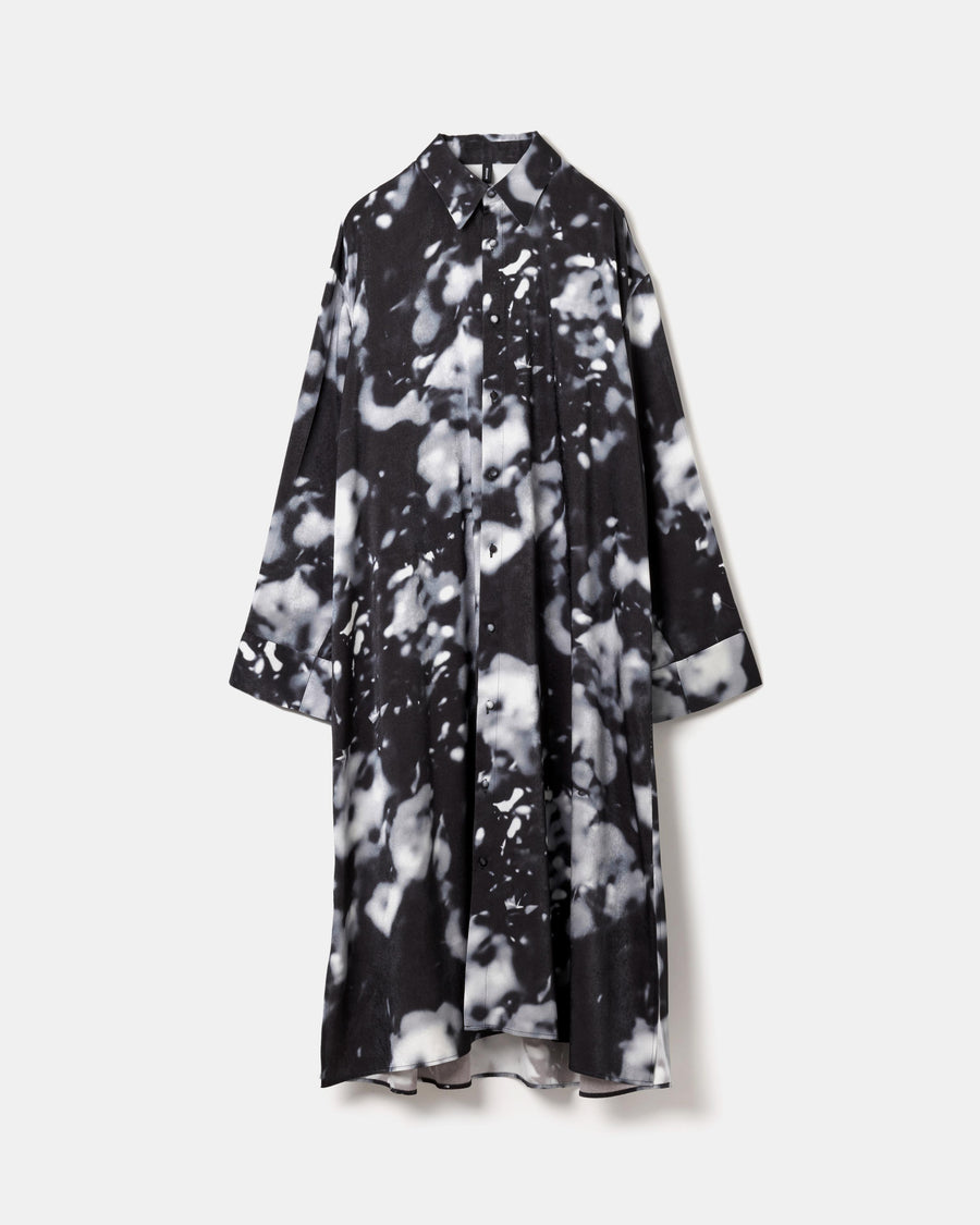 ムラ感のある抜染柄をあえてプリントで表現し、さらにぼかしたような曖昧な仕上がりが現代アートのような奥行きを感じさせる1着。