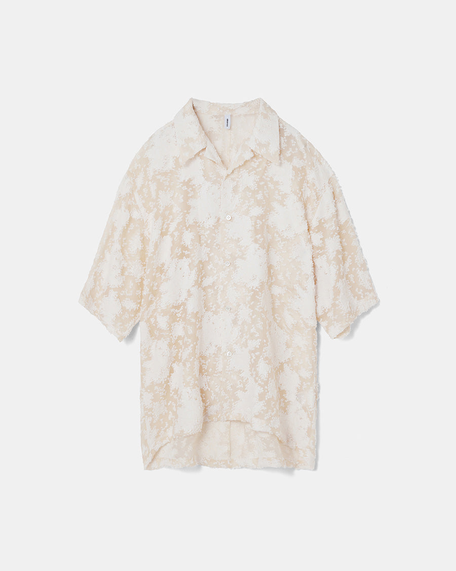 透け感と繊細な花柄が特徴的なオープンカラーシャツ。