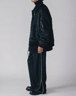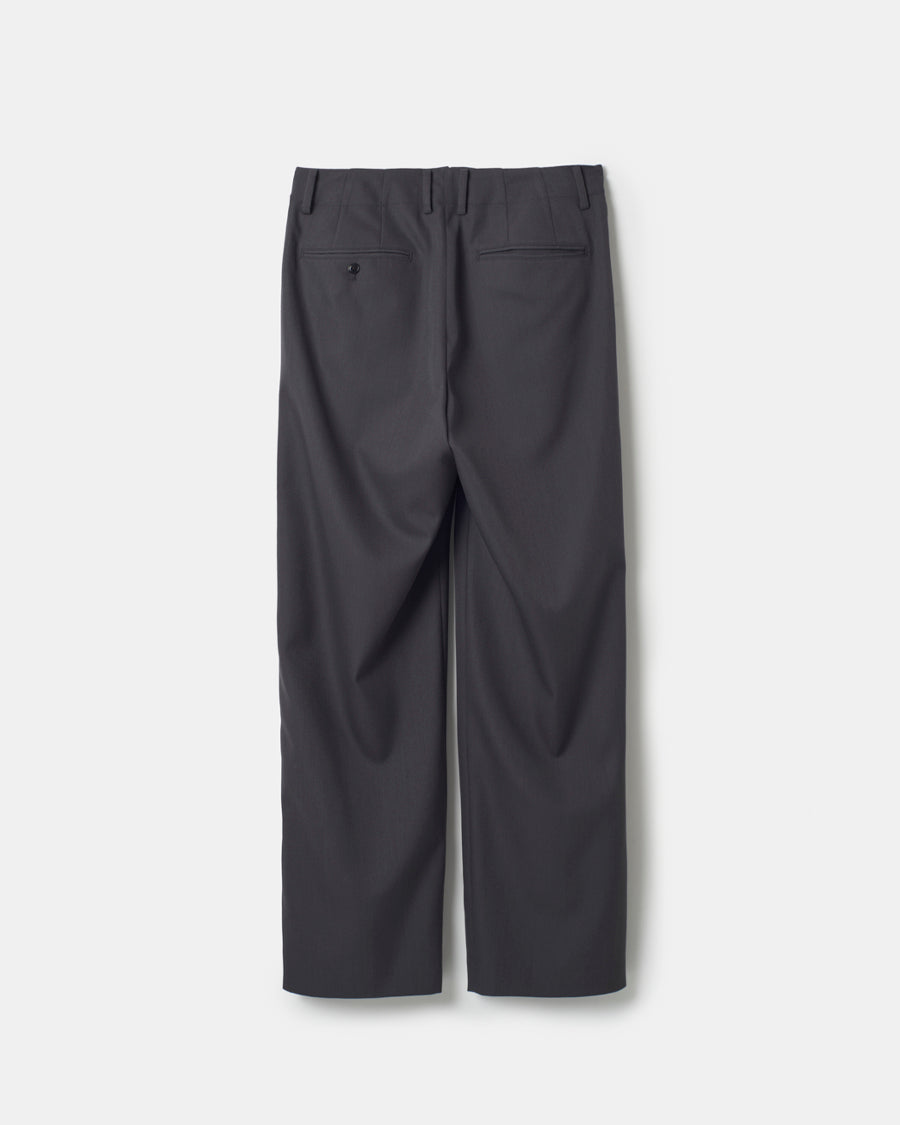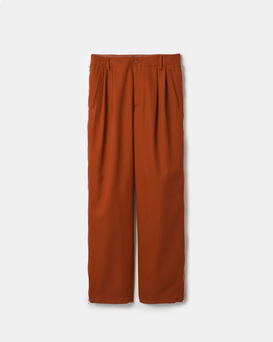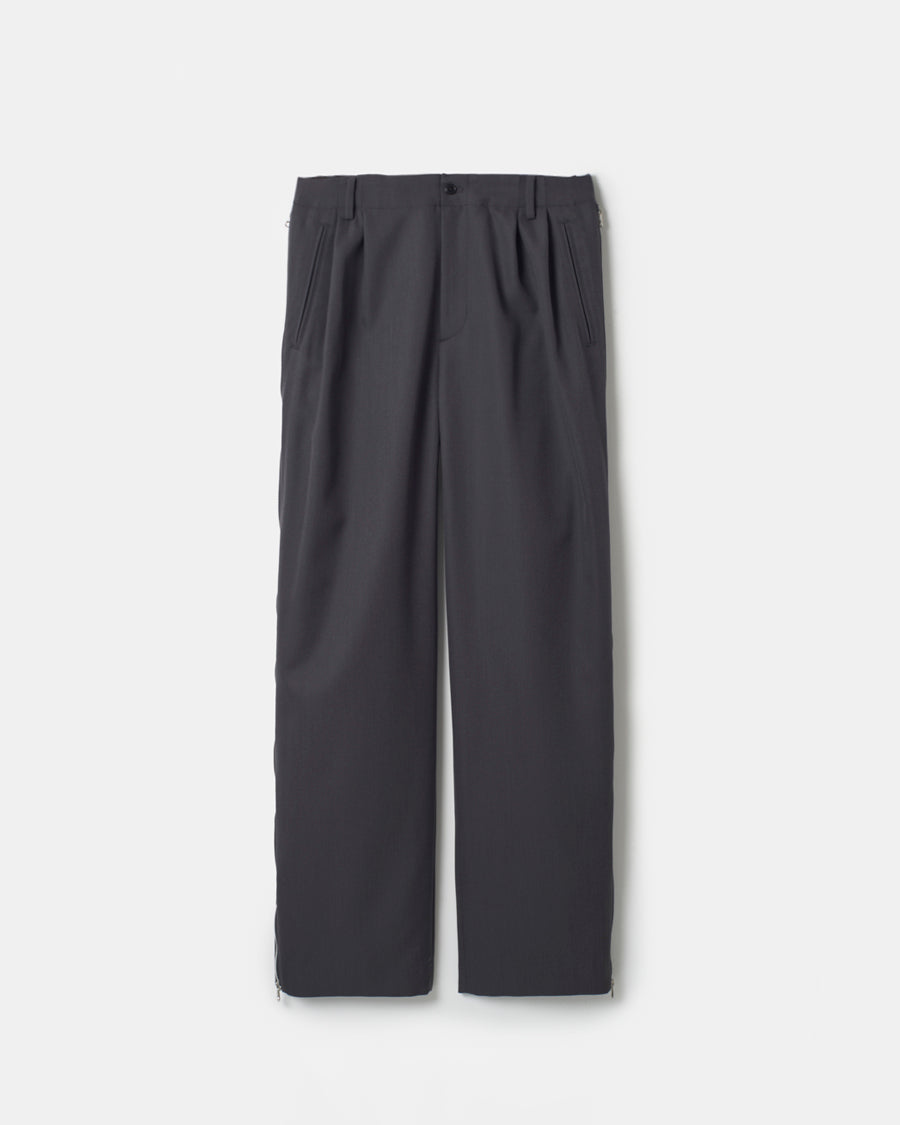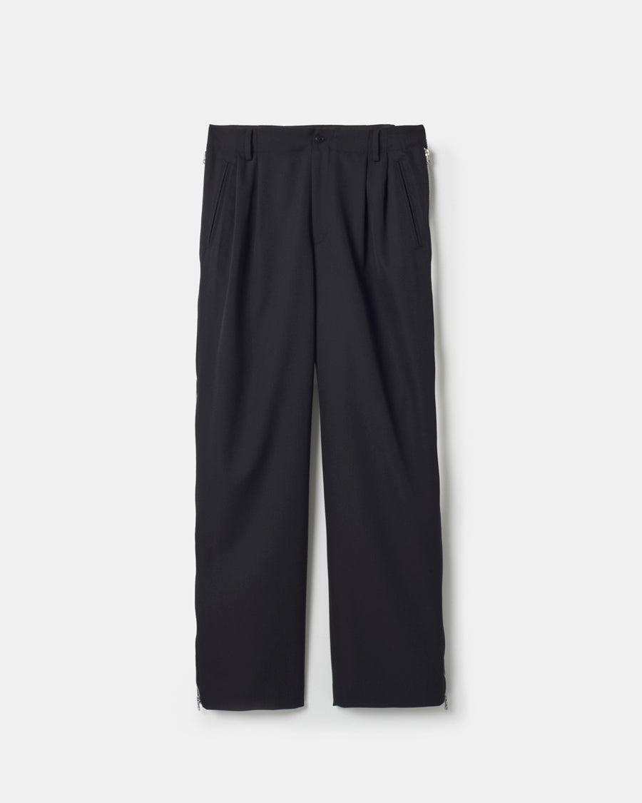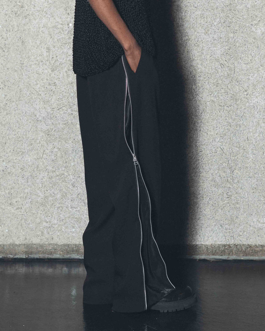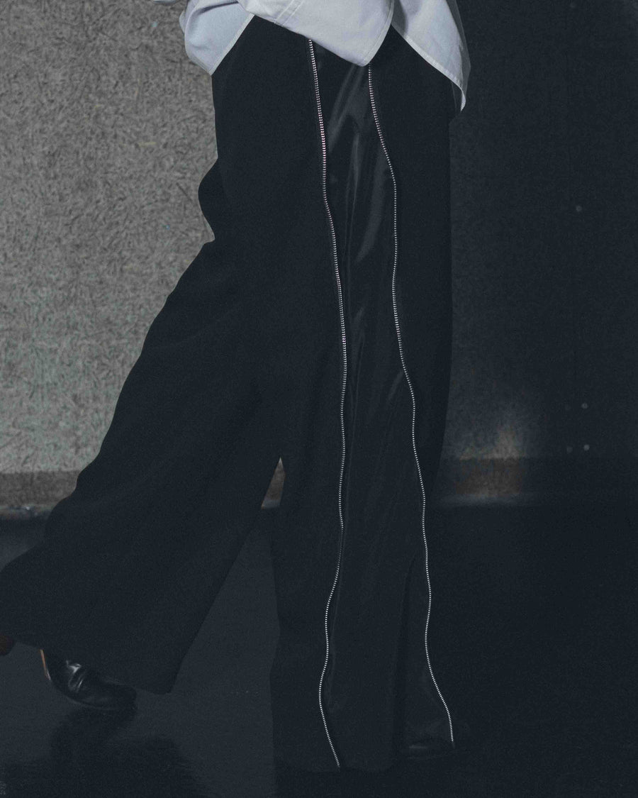ストレートシルエットのジップパンツ。脇はマチ付きファスナー開きのデザインで、上下両側から開閉可能。開ける位置によってシルエットが変化し、様々なスタイルを楽しむことができる。