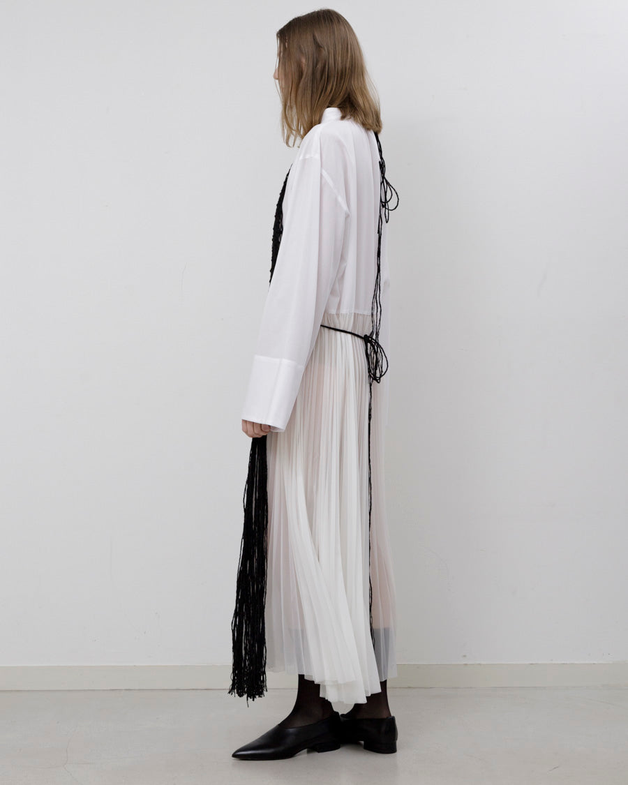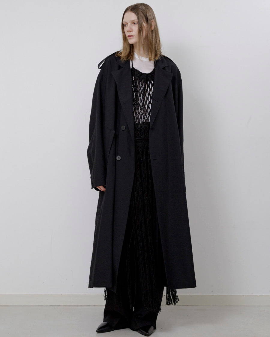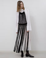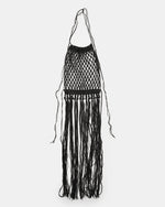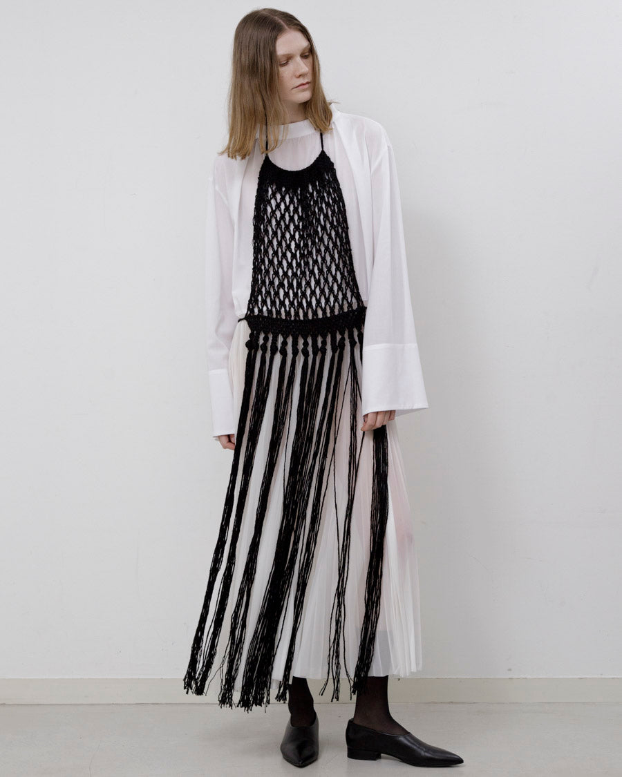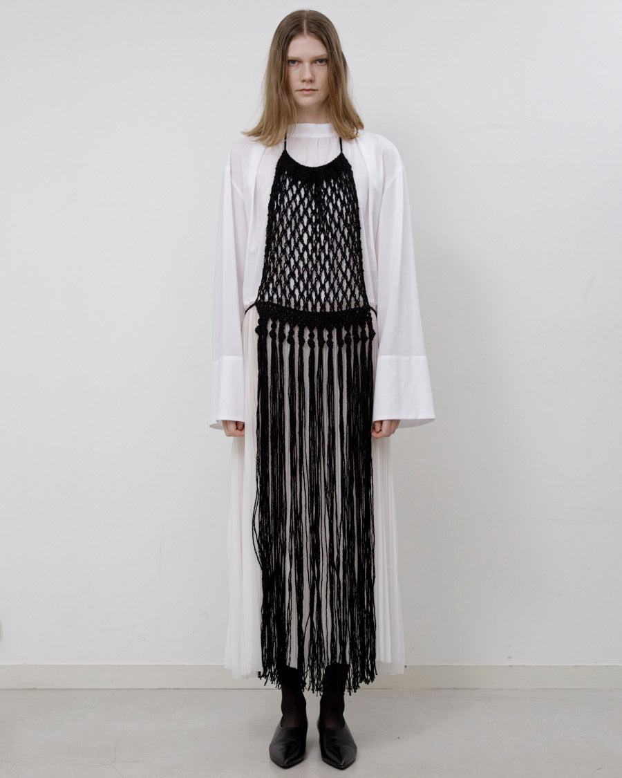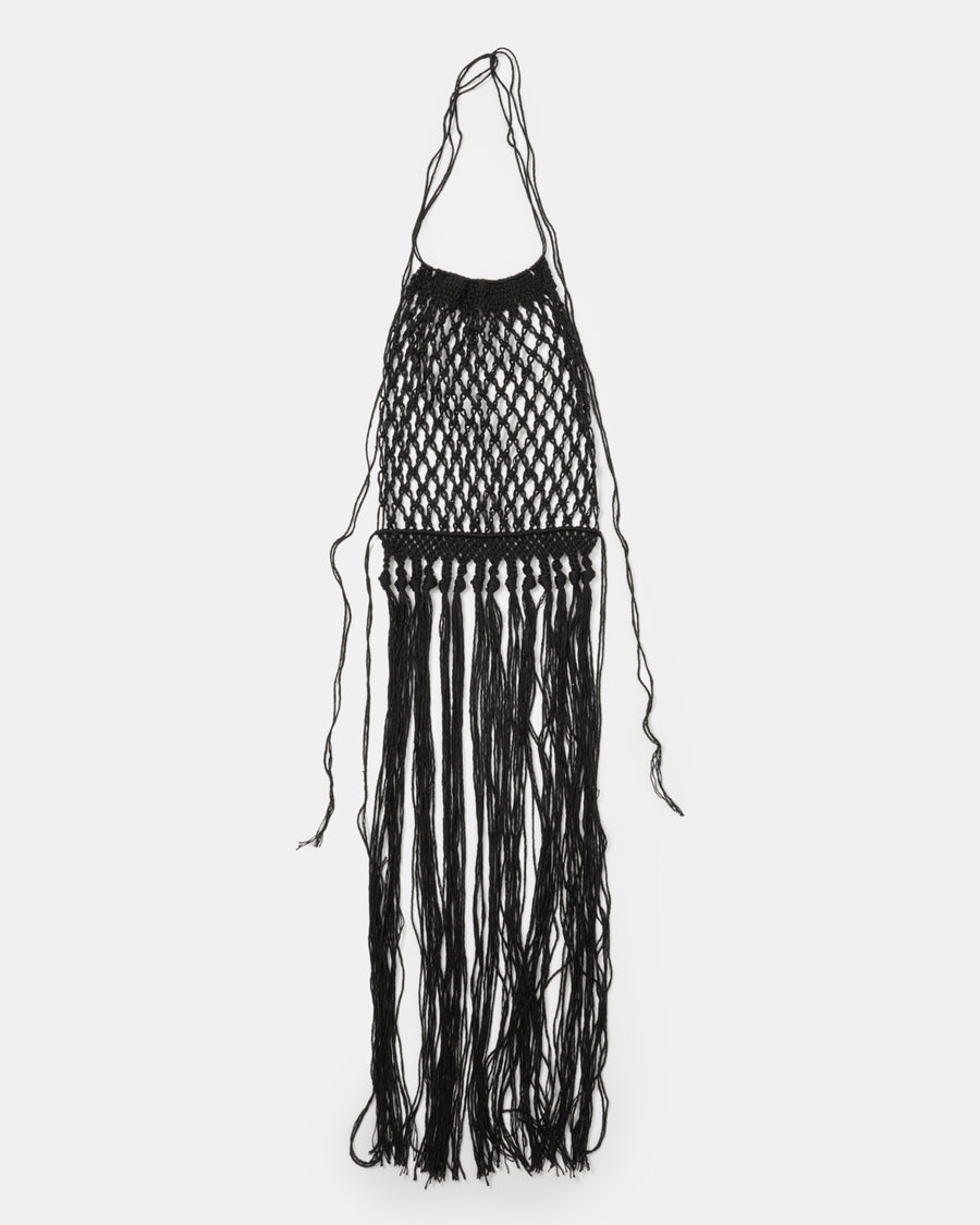 太番手のリネンを贅沢に使い、手でざっくりと編み上げた。長く垂れ下がったフリンジが動くたびに美しく揺れ、様々なスタイリングにスパイスを加えることができるアクセサリーのようなアイテム。