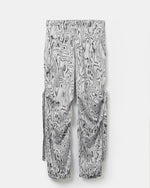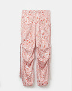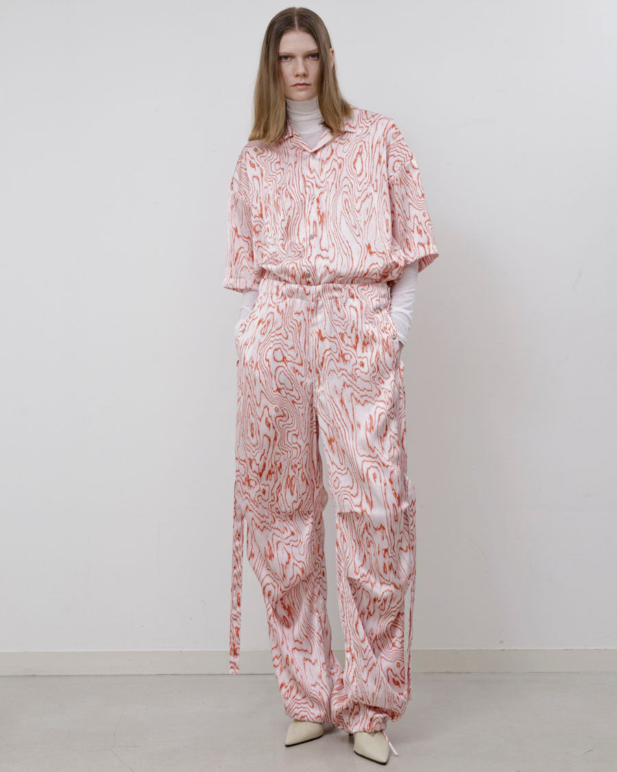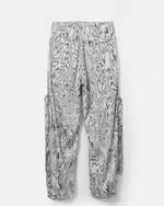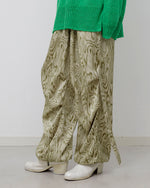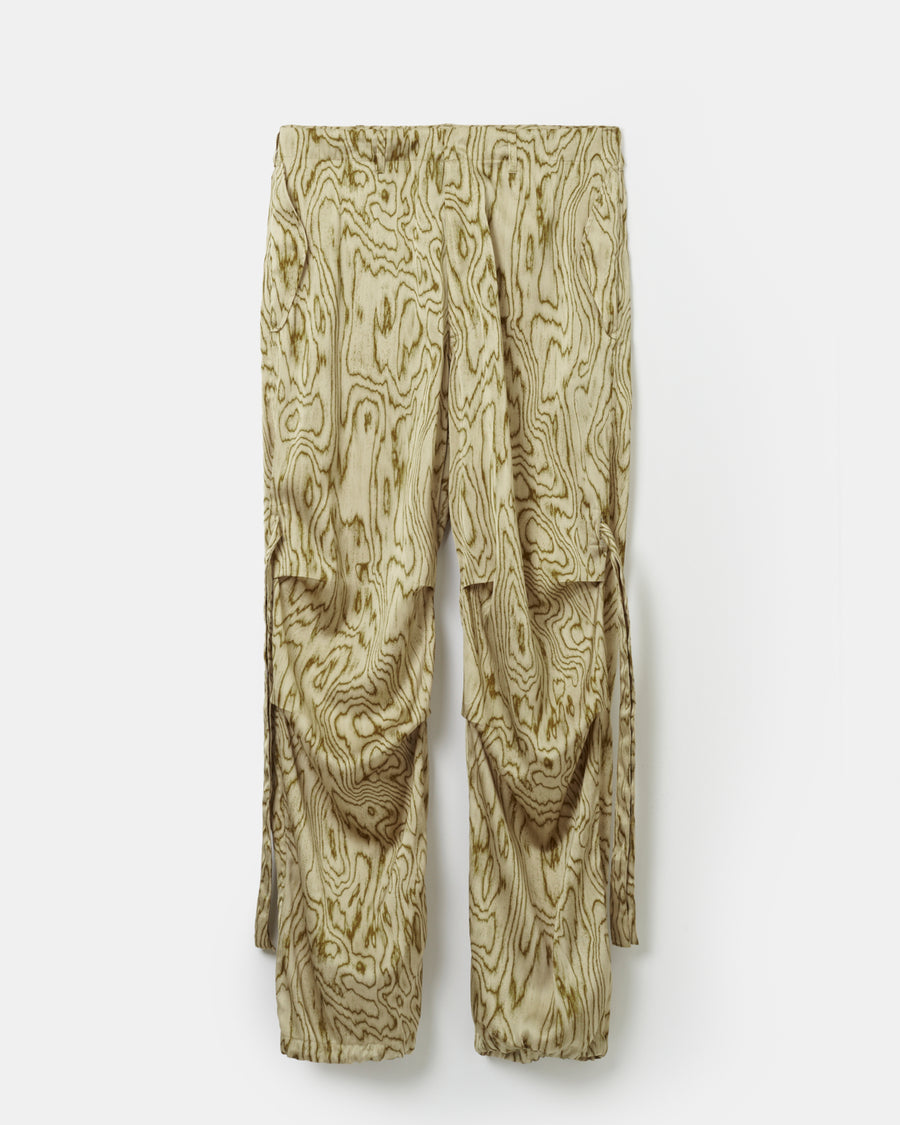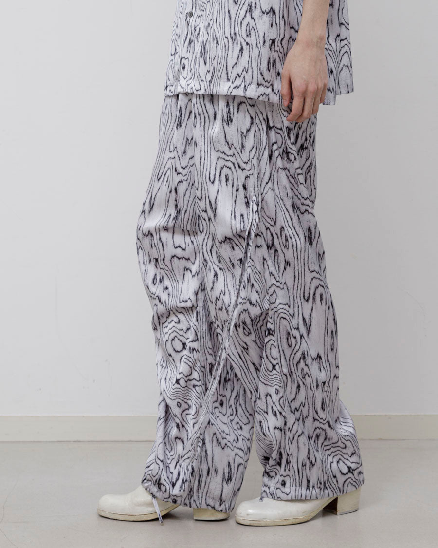 目を惹くモアレ柄プリントのパラシュートパンツ。