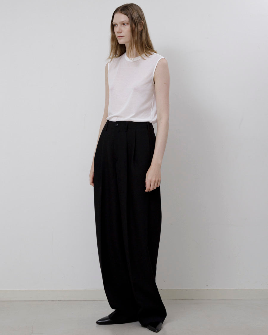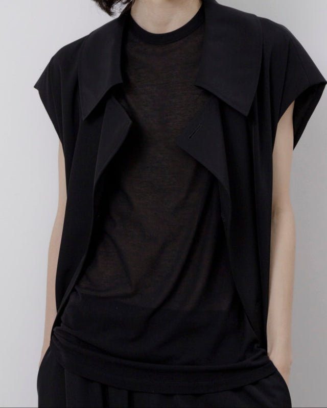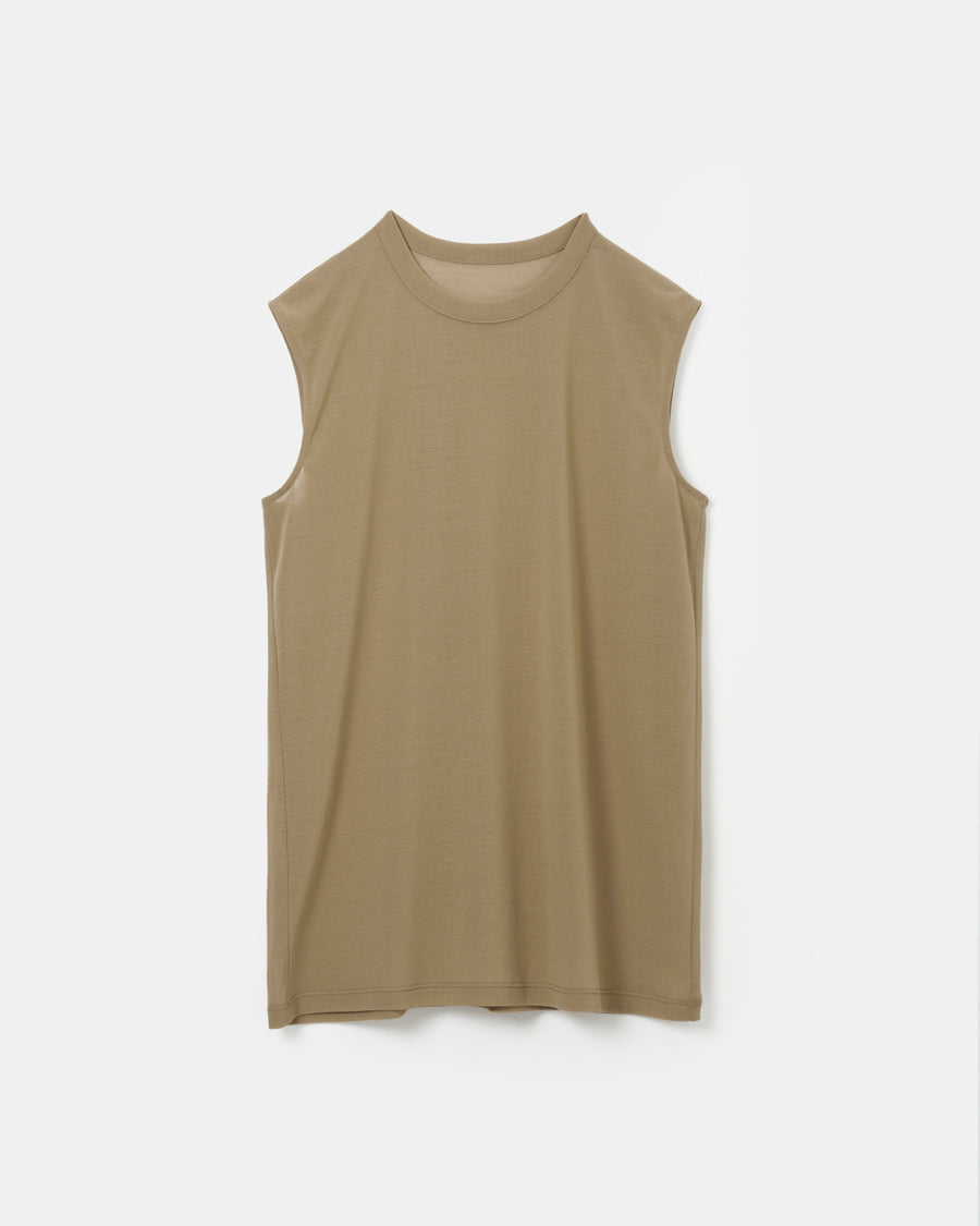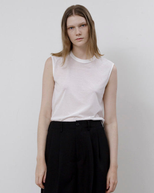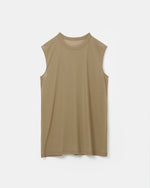 繊細な透け感が特徴的なスリーブレストップ。素材はコットン100%の細い強撚糸を繊細に編み上げたドライタッチの天竺を使用。