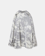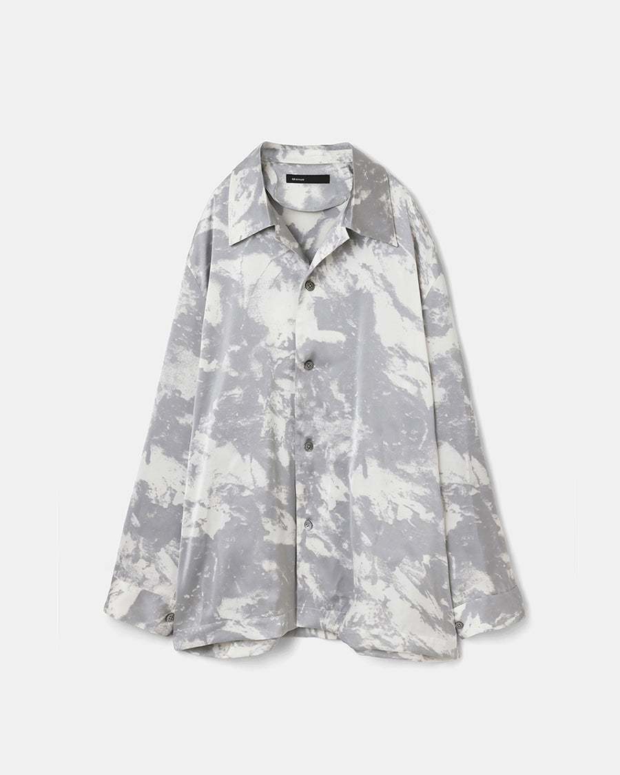 特徴的な柄は版を用いたプリントで染めたような曖昧な柄を表現し、ニュートラルで落ち着きのある印象に仕上げた。ヴィンテージのような軋みのあるサテンを使用したエレガントで上品な1着。