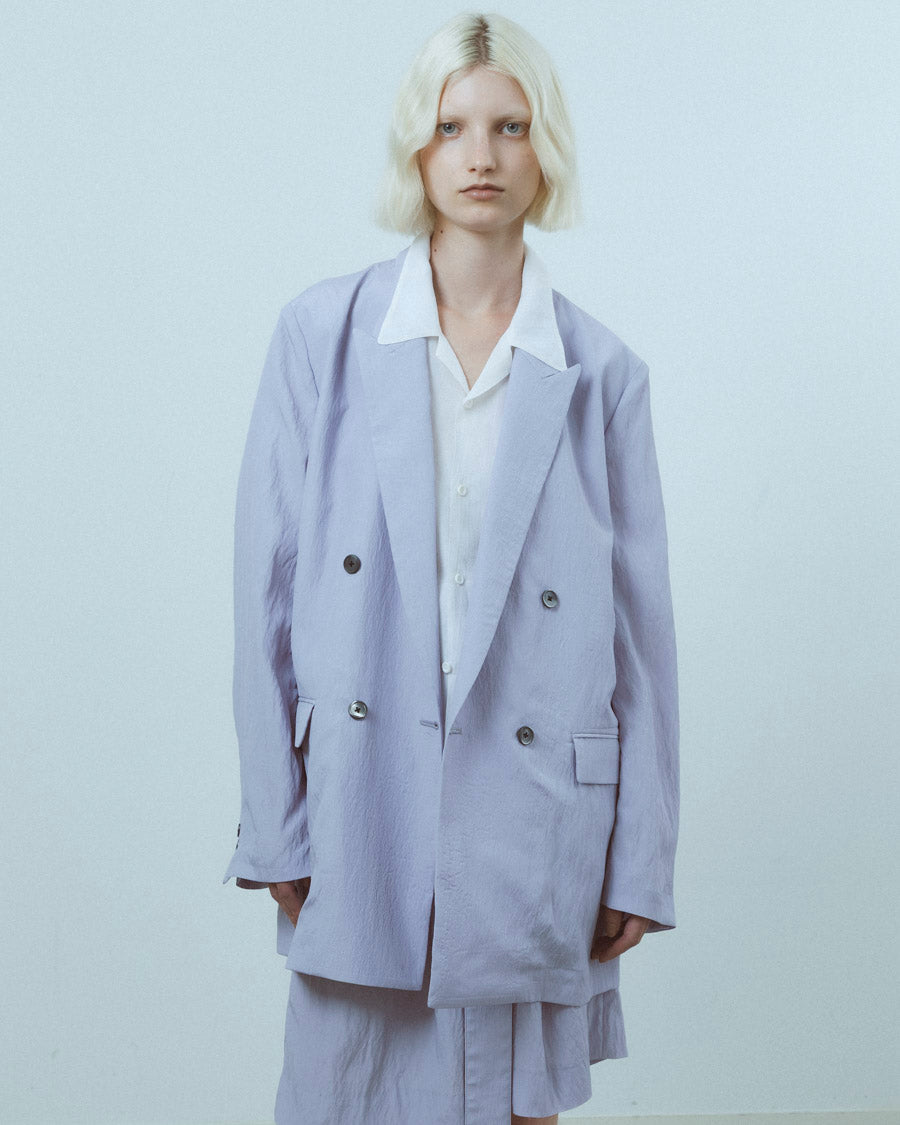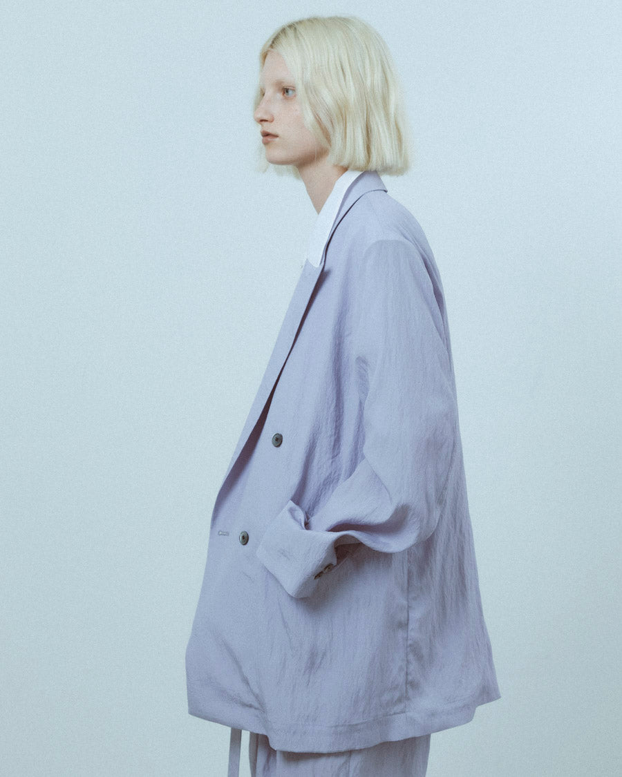 ボクシーなシルエットでゆったりとした分量感。かっちりしたジャケットをラフに仕立てることで抜け感を加えている。デザインポイントは深めに開いたバックスリットで、動きやすさも取り入れた。