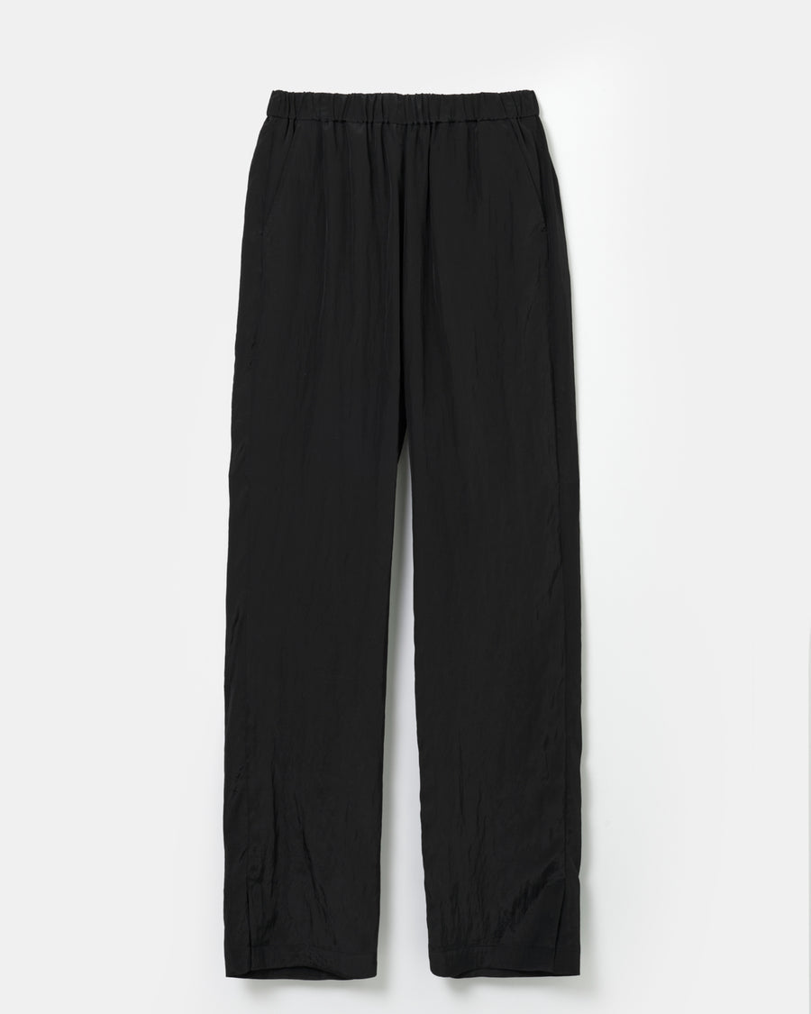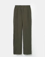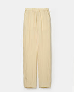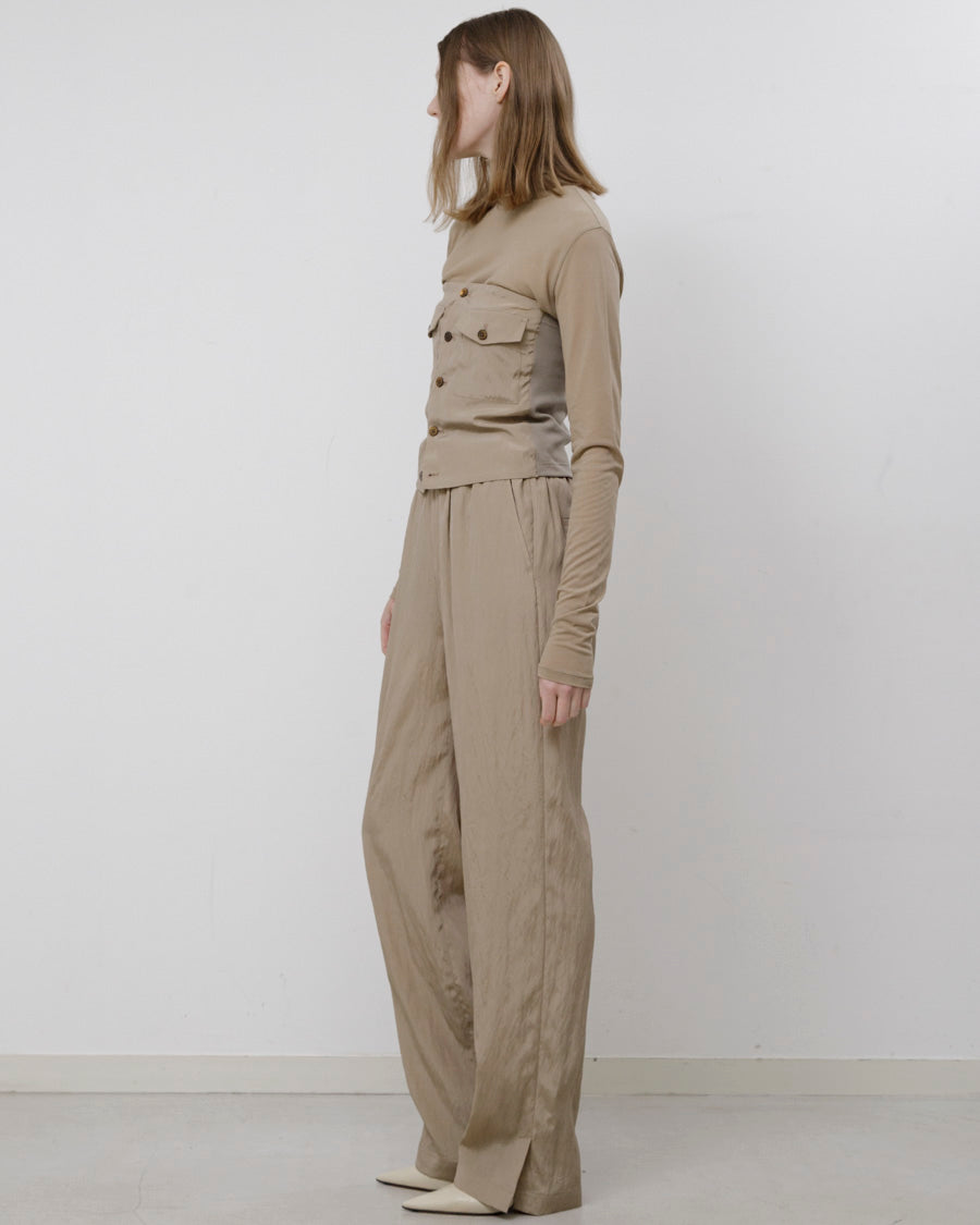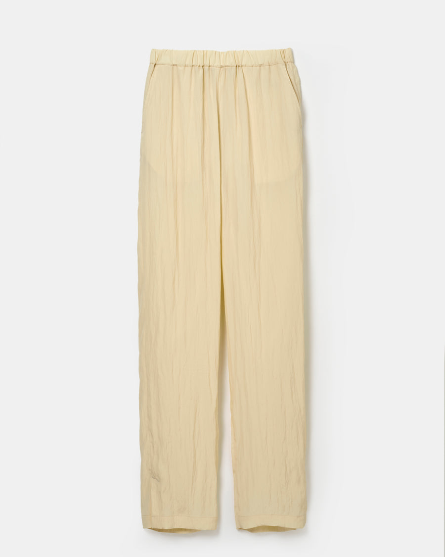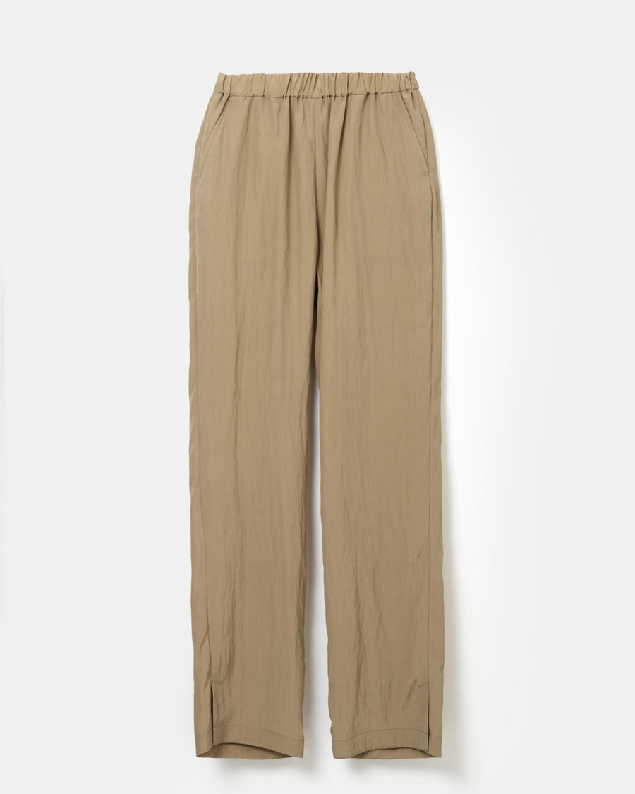 素材はヴィスコースナイロンの平織りを使用。生地にワッシャー加工を施し、上品な光沢と馴染む表面感に仕上げたヴィンテージエレガントなパンツ。