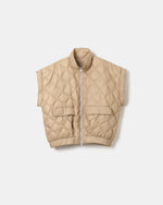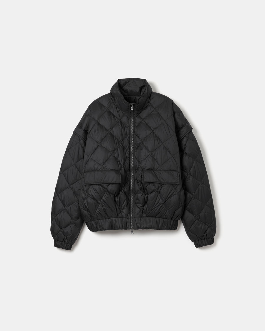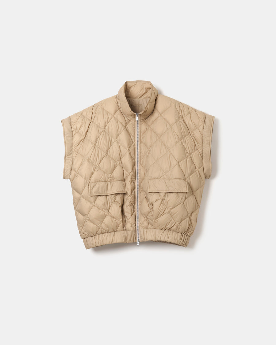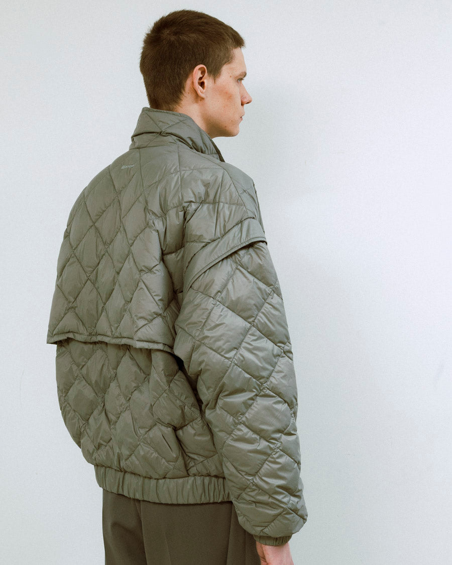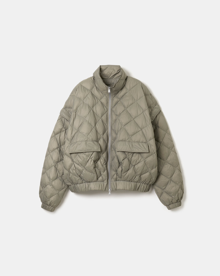 袖は取り外し可能で、シーズンやスタイリングに応じて軽やかなベストとしても着用可能。ベースとなったのは、80年代のワイドなバランスを取り入れた構築的なシルエット。ダウンによる柔らかなフォルムとショート丈のコントラストが、モダンな佇まいを際立たせる。表裏は共にマットな質感のナイロン素材を使用し、一方にはキルティングを施し、もう一方はフラットな表情に仕上げることで、リバーシブルながら異なるムードを楽しめる仕様。高い保温性と軽さを兼ね備えたTAIONのダウンが、無駄のないミニマルな設計の中に柔らかな機能性を感じる1着。
