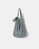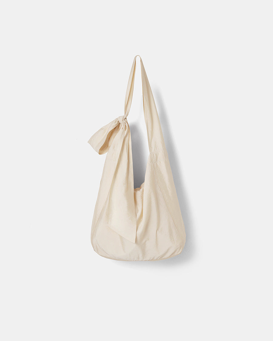 今シーズンのコレクションアイテムと同素材で作った08sircus定番のショルダーバッグ。リボンのような結びのディティールが目を惹くデザインは、本体の脇から続いたベルトを好きな長さで結べる仕様となっており、コーディネートにさりげないアクセントを加えてくれる。 素材はヴィスコースナイロンのオーガンジーを使用。繊細で落ち着きのある透け感とヴィンテージのような表面感が、エレガントさとモードな雰囲気を両立したデザインを引き立てる。