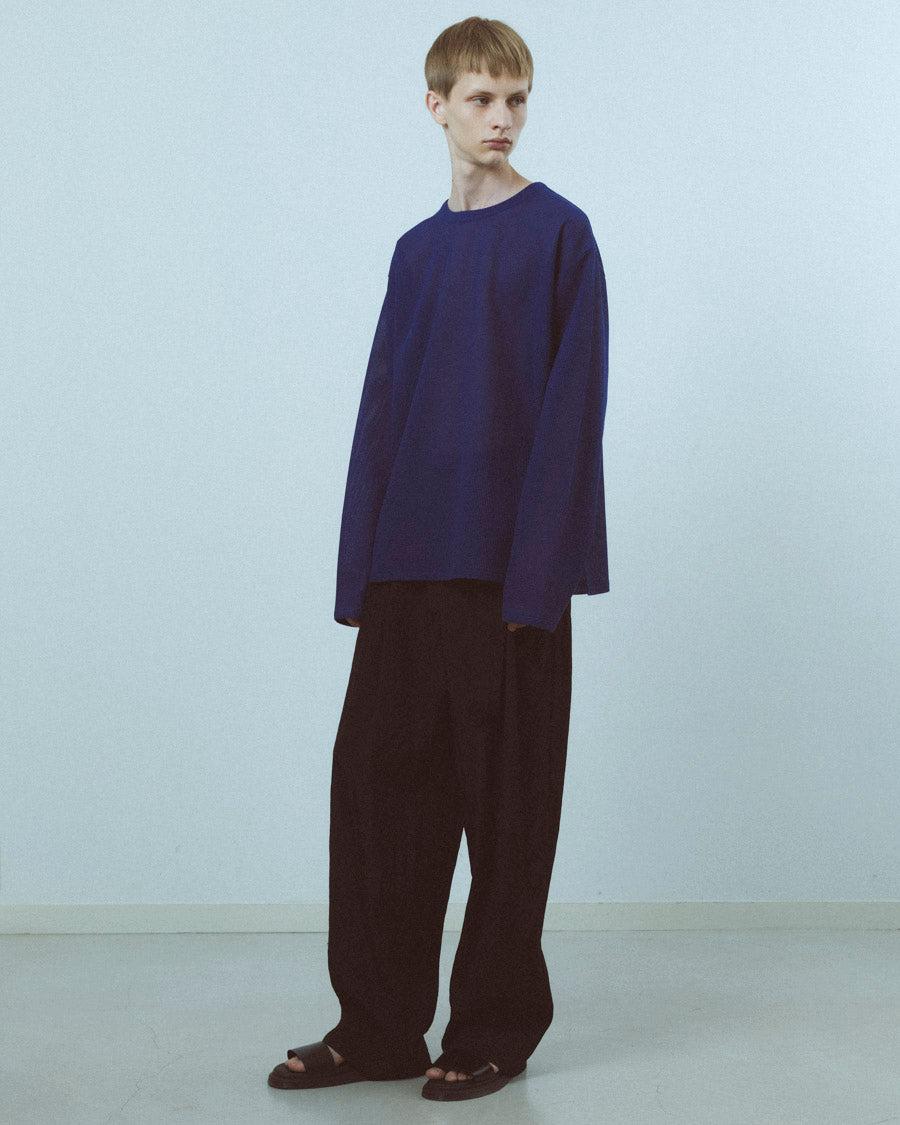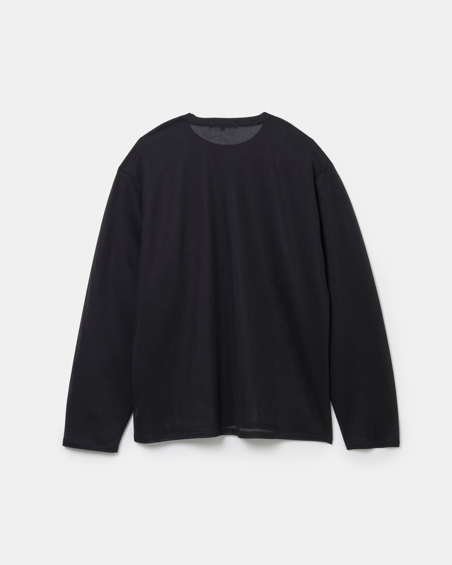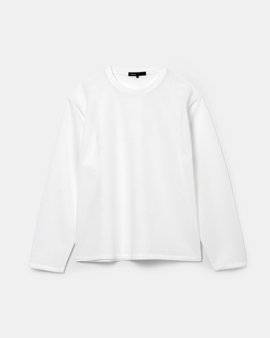 細やかでフラットなワッフル組織が上品な質感を生み、クリーンな印象に仕上がっている。ゆったりとしたボックスシルエットと軽やかな透け感で、レイヤードスタイルにさりげないニュアンスを添える1着。