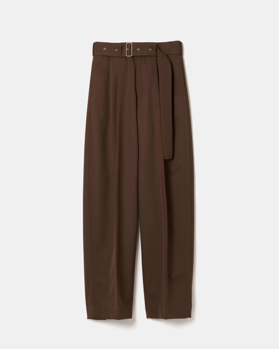 共地ベルトで腰回りをシャープな印象にすることで、ルーズなボリューム感にメリハリをつけたバランスが美しい1着。
