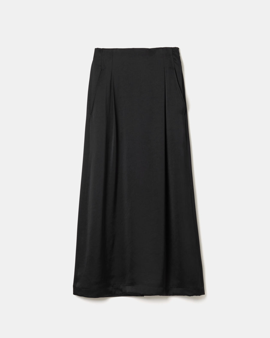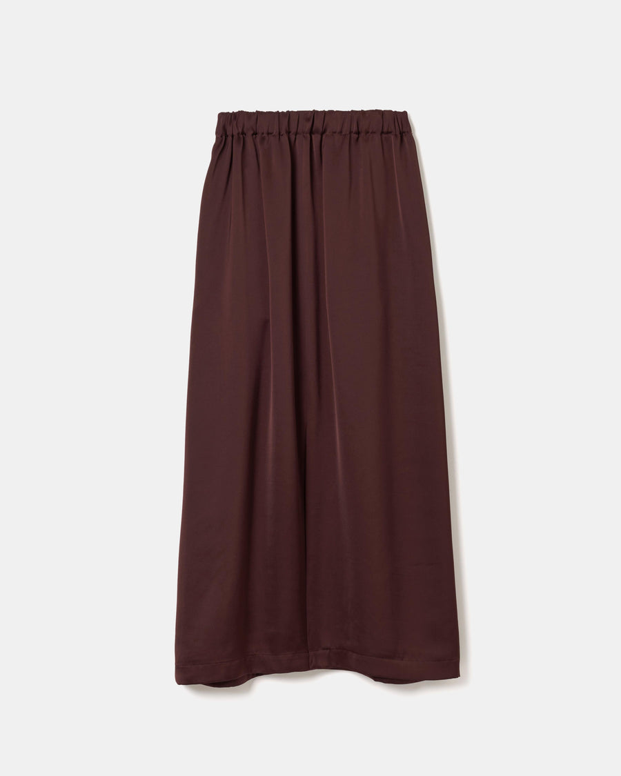 素材には、上品な光沢のヴィスコースサテンを使用。肉厚でありながらも柔らかく、ウールのようなハリ感と美しい落ち感を兼ね備え、エレガントな雰囲気を作り出す。