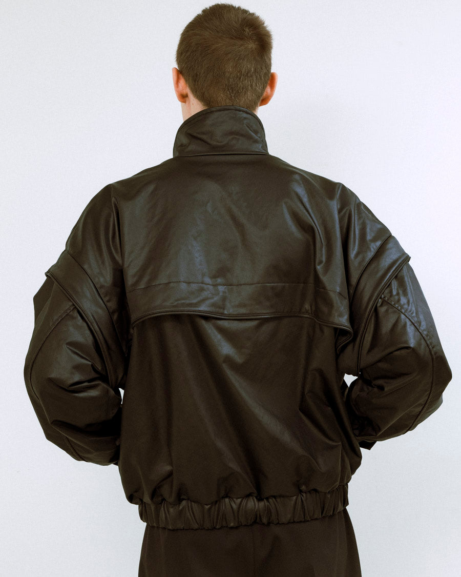 80年代のワイドなバランスをベースに、肩まわりや身頃にたっぷりとしたボリュームをもたせて構築的に仕上げたデザイン。パディングによる柔らかなフォルムとショート丈のバランスが、素材の質感とコントラストを生み出してモダンな佇まいをより一層引き立てる。