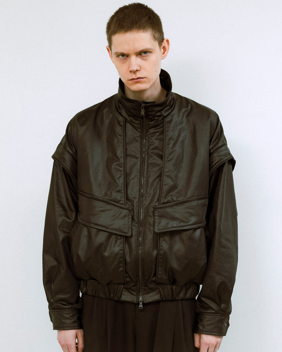 袖は取り外しが可能で軽やかなアウターへと変化させることができ、スタイリングや季節に応じた着こなしが可能。機能性とデザインが共存し、現代的な空気感を纏う。