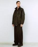 ゆったりとしたオーバーサイジングで迫力のある構築的シルエット。ベージュで地染めをした後、黒の顔料をコーティングし、シームの顔料を落とすことで奥行きのあるヴィンテージ感を加える。エレガントかつモードな存在感を兼ね備えた1着。