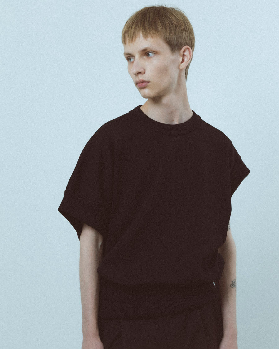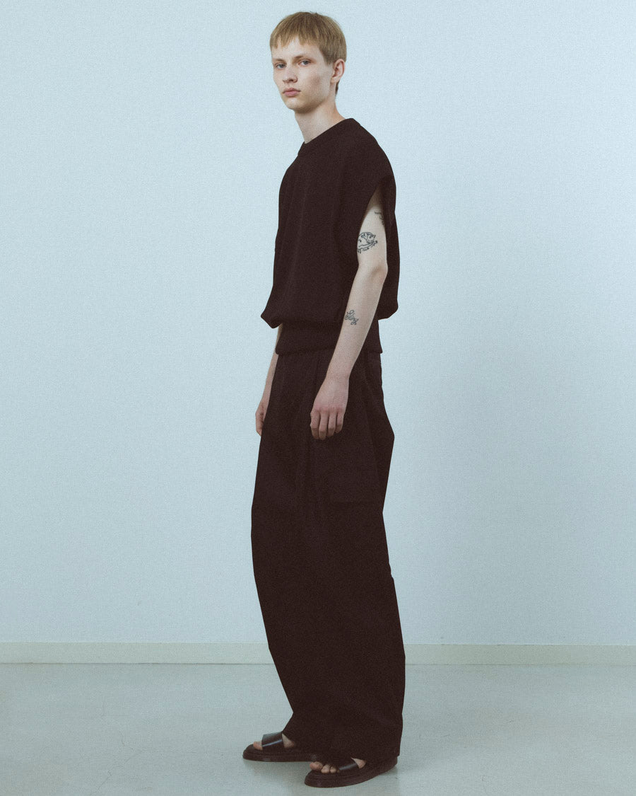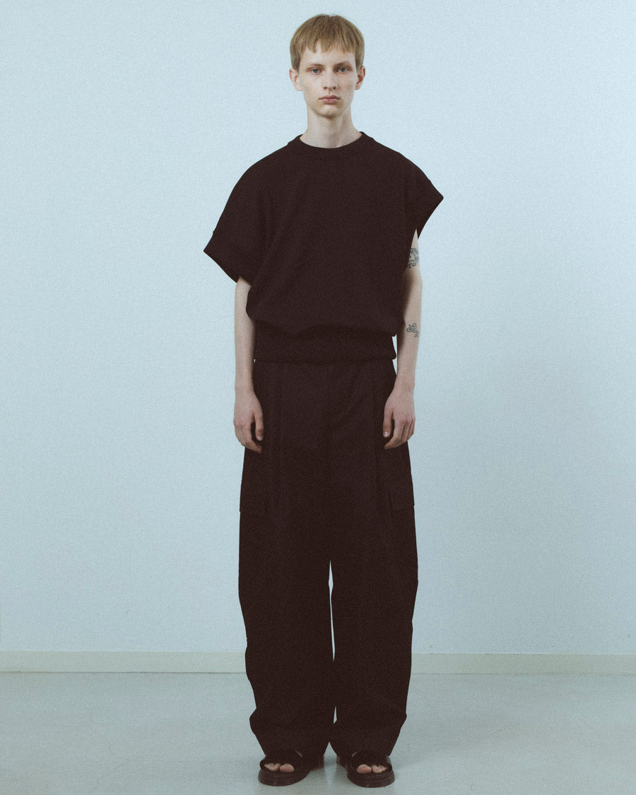 アシンメトリーで捻りのあるデザイン。裾のリブはキックバックが強く、短丈で身頃のボリュームを溜めるなど魅せ方を変えられる部分もポイント。