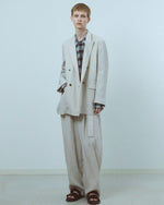 程よくゆとりのあるボックスシルエットに、袖山から袖口にかけてタックを入れたプリーテッドスリーブを組み合わせた。肩の力が抜けたリラックス感と、構築的な表情を両立させている。