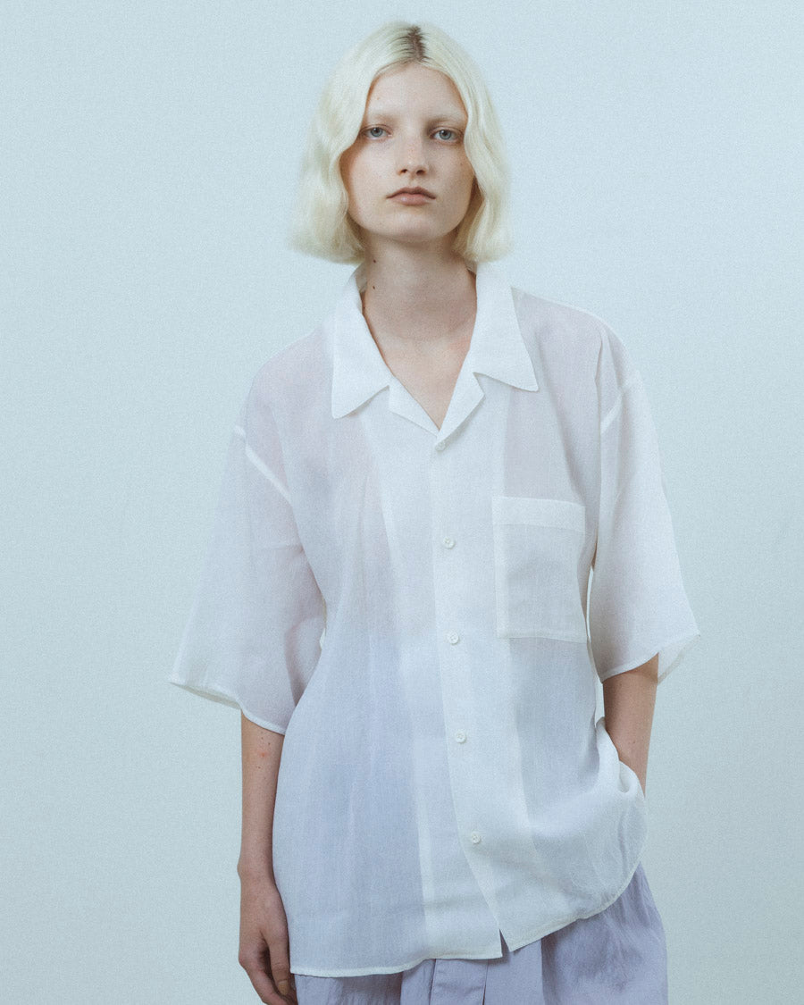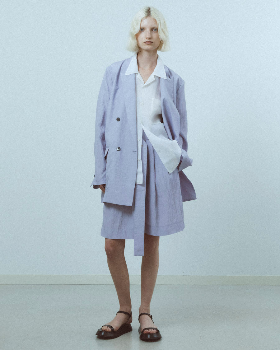 キュプラの生地に塩縮加工を施し、仕上げは加工による細かなシワを美しくセット。凹凸を抑えつつニュアンスのあるクリーンな表情に整えている。塩素によるわずかな色ムラが独特の陰影を生み、その特別感はまるで一点物。加工の質感と上品な透け感が合わさることで、エレガントな雰囲気を纏う。
