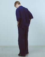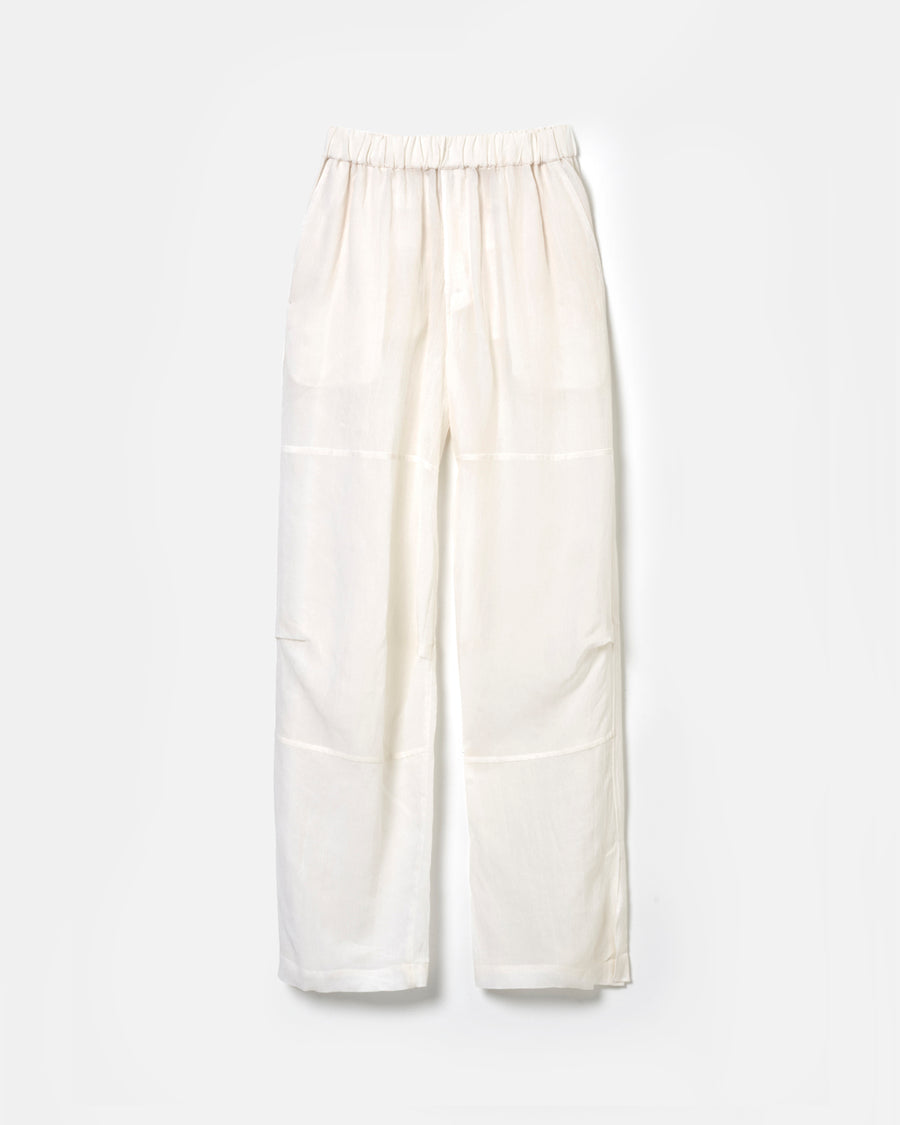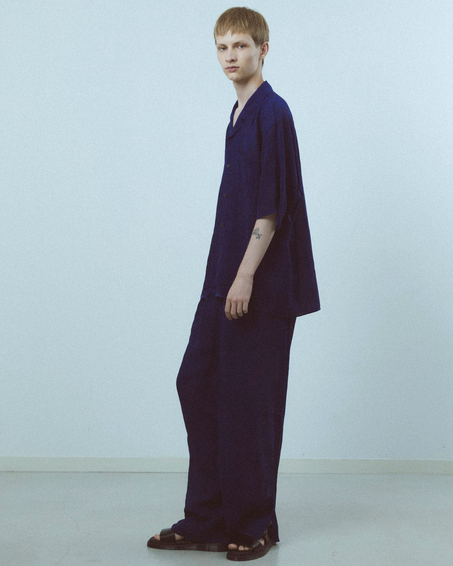 キュプラの生地に塩縮加工を施し、仕上げは加工による細かなシワを美しくセット。凹凸を抑えつつニュアンスのあるクリーンな表情に整えている。塩素によるわずかな色ムラが独特の陰影を生み、一点物のような特別感をもたらす。加工の質感と上品な透け感が合わさることで、エレガントな雰囲気を纏う。