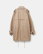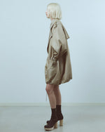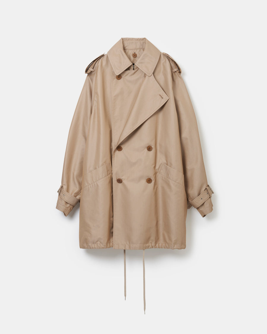 コレクションの中でもひときわ存在感を放つ、ミッド丈のトレンチコート。
