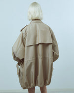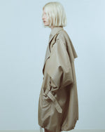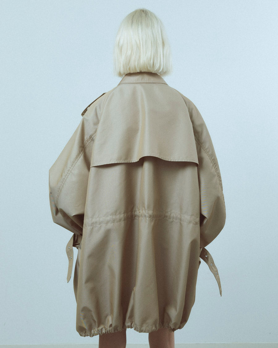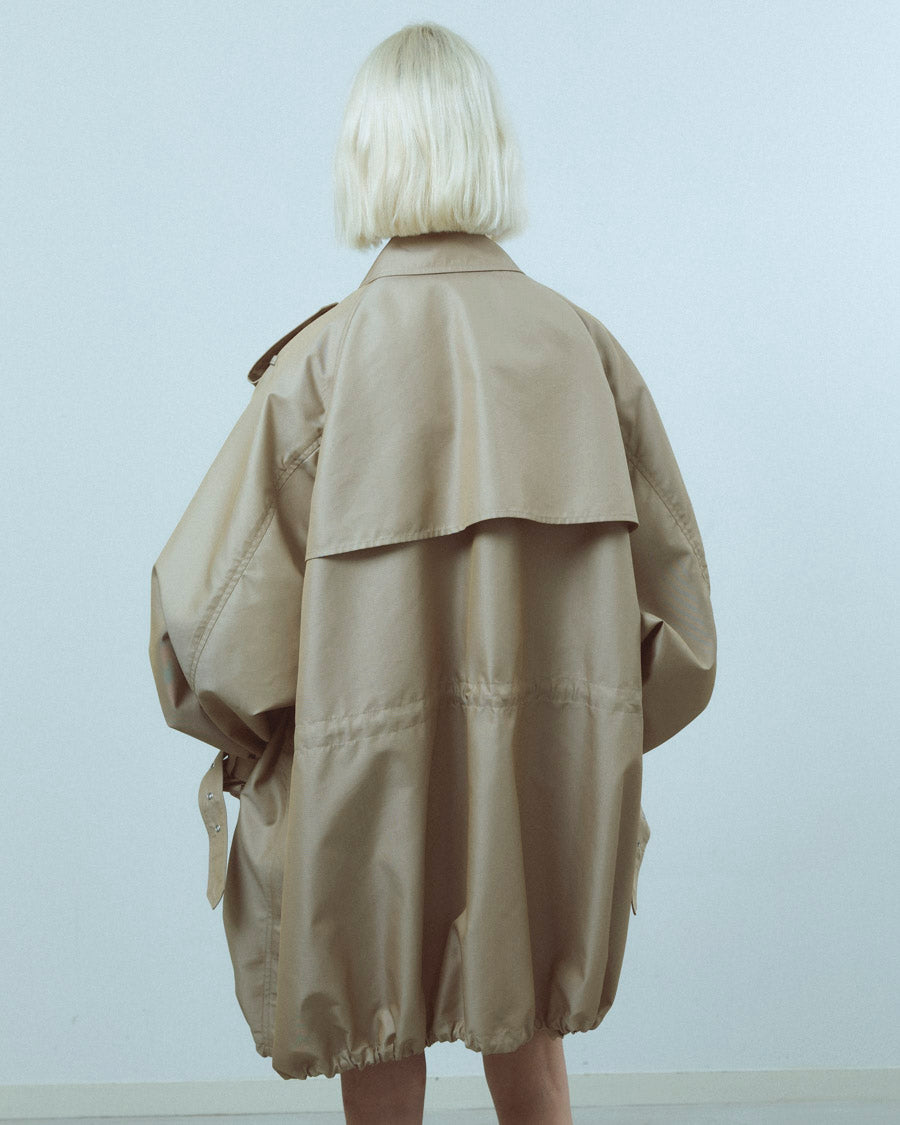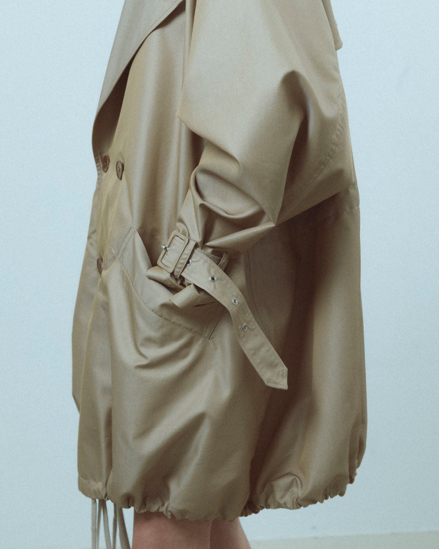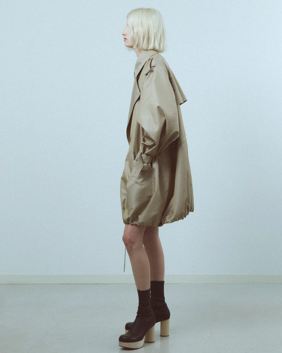 裾にあしらったドローコードで、フォルムにボリュームとギャザーを加え、迫力のある立体感を生み出す。また、ラグランスリーブにはセットインスリーブかのようなラインを描かせることで、身頃のボリュームに対して肩まわりが大きく見えすぎず、全体のバランスを整えている。