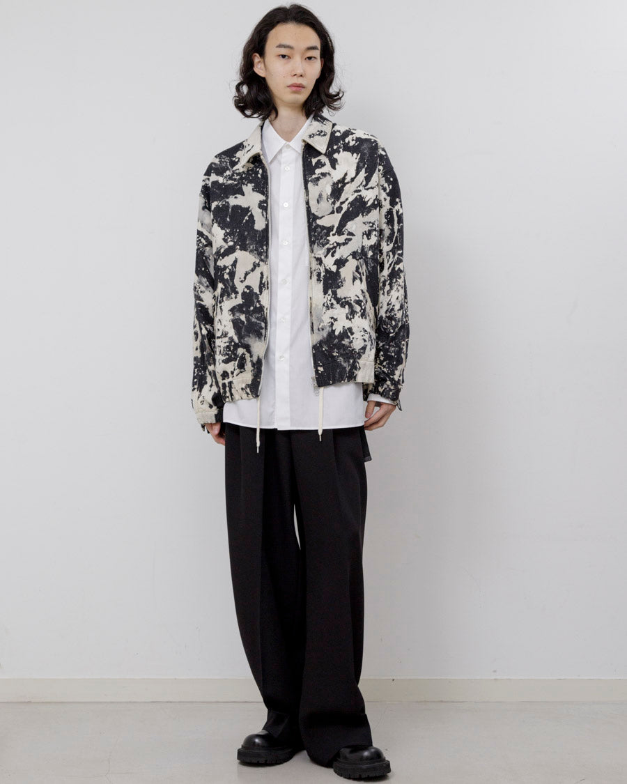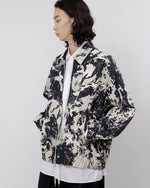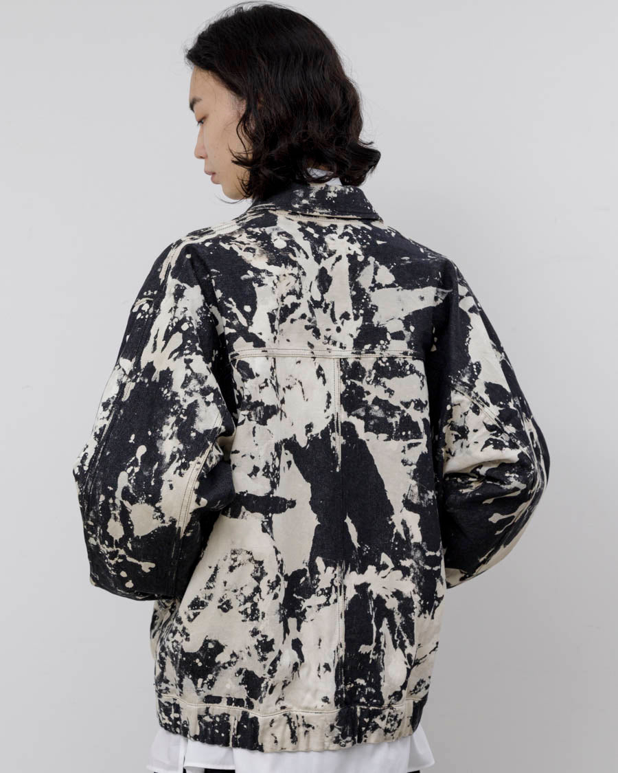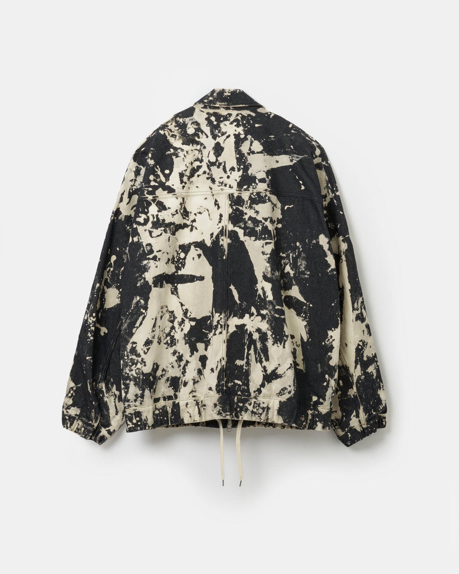 日本の伝統的な染色手法である籠抜染を施したジップアップデニムジャケット。