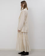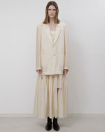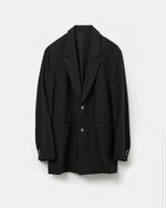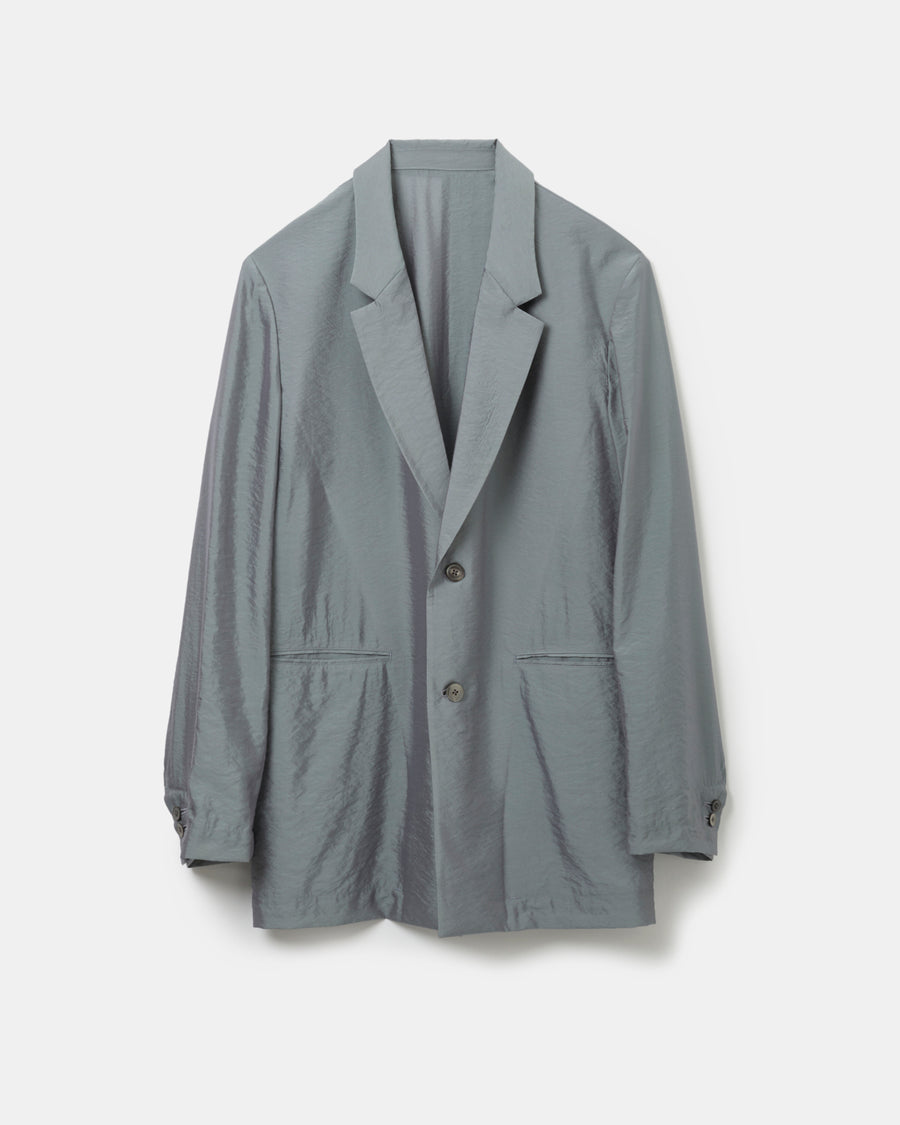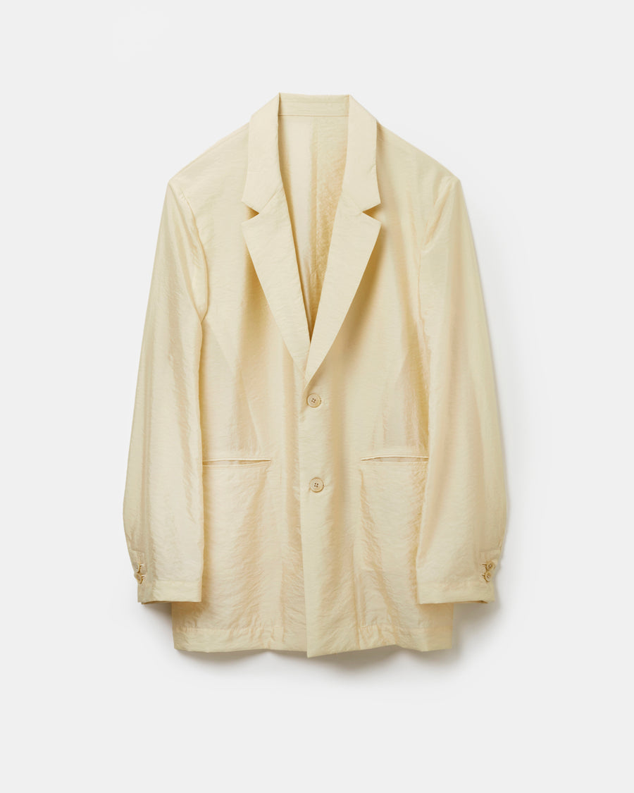 ボクシーなシルエットでゆったりとした分量感。かっちりしたジャケットをラフに仕立てることで抜け感を加えた。深めに開いたバックスリットで動きやすさも取り入れた。