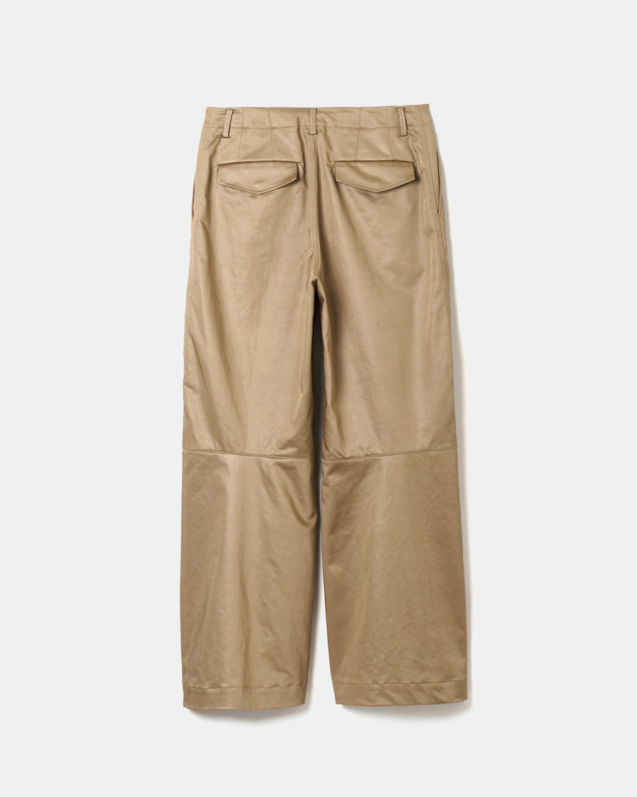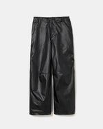 ヴィンテージレザーのような質感が印象的なワイドパンツ。