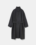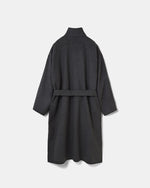 職人の手まつりによる"リバー縫製"で仕立て上げ、シームのストレスがなく、軽くてシンプルな作りを追求した。包み込むようなゆったりとしたボリュームを直線的なラインで設計することで、着用時に余った分量が程よいドレープになり、美しいシルエットを生む。身頃の分量感に対して衿はすっきりとしたバランスにしている為、全体的に大きく見えすぎないデザインも拘ったポイントである。